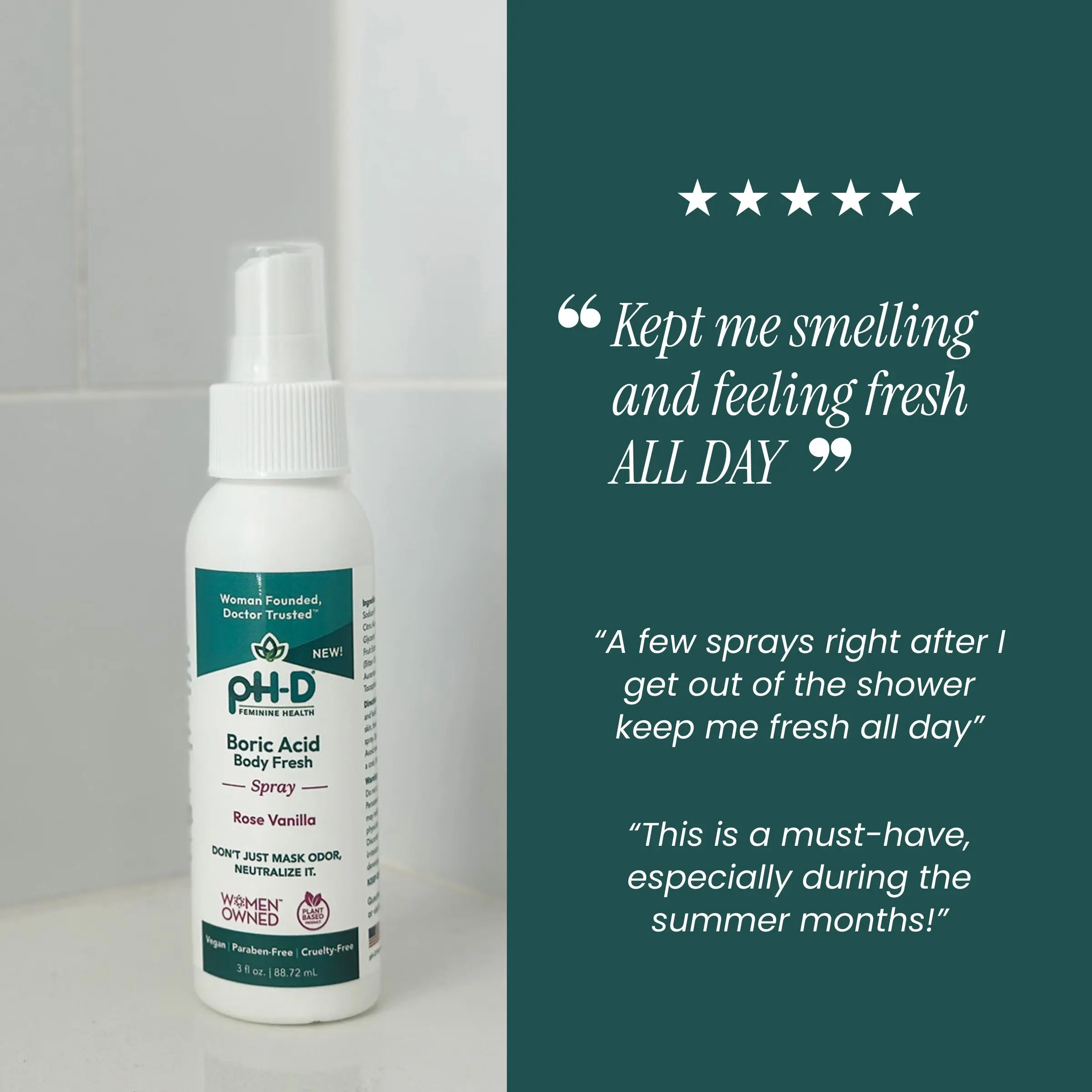 I recently tried the PH-D Boric Acid Body Fresh Spray and love it. It keeps me feeling fresh and confident all day. The rose vanilla scent is lovely and subtle. I appreciate that it’s vegan, cruelty-free, and free of harmful chemicals, making it a safer choice for me and the environment. The unique formula includes tangerine, bitter orange, and orange peel extracts, which neutralize odors instead of masking them. My experience has been amazing—I noticed a big difference in how fresh and clean I felt from the first use. It's now a must-have in my daily routine for a quick refresh on the go, whether at work, the gym, or running errands. The travel-friendly size is perfect for my bag. I highly recommend it to anyone looking to stay fresh!