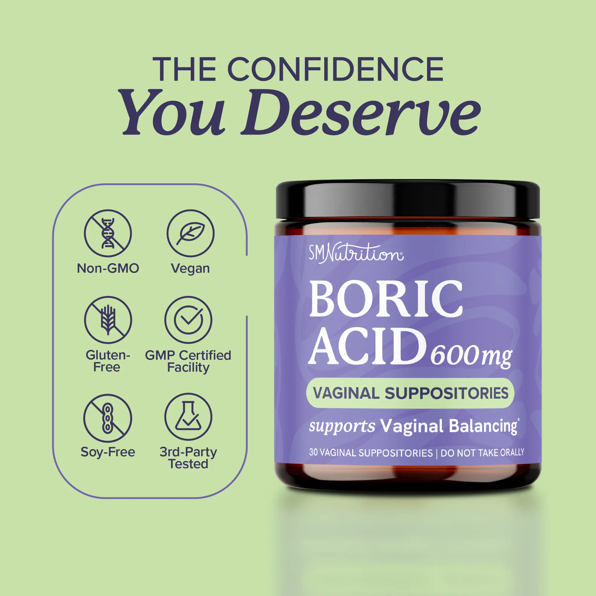 THE SMNUTRITION DIFFERENCE: Our Boric Acid Vaginal Suppositories are formulated Vegan, Non-GMO, Gluten-Free, and Soy-Free. They are Third-Party Tested and manufactured in a facility that adheres to cGMP guidelines.