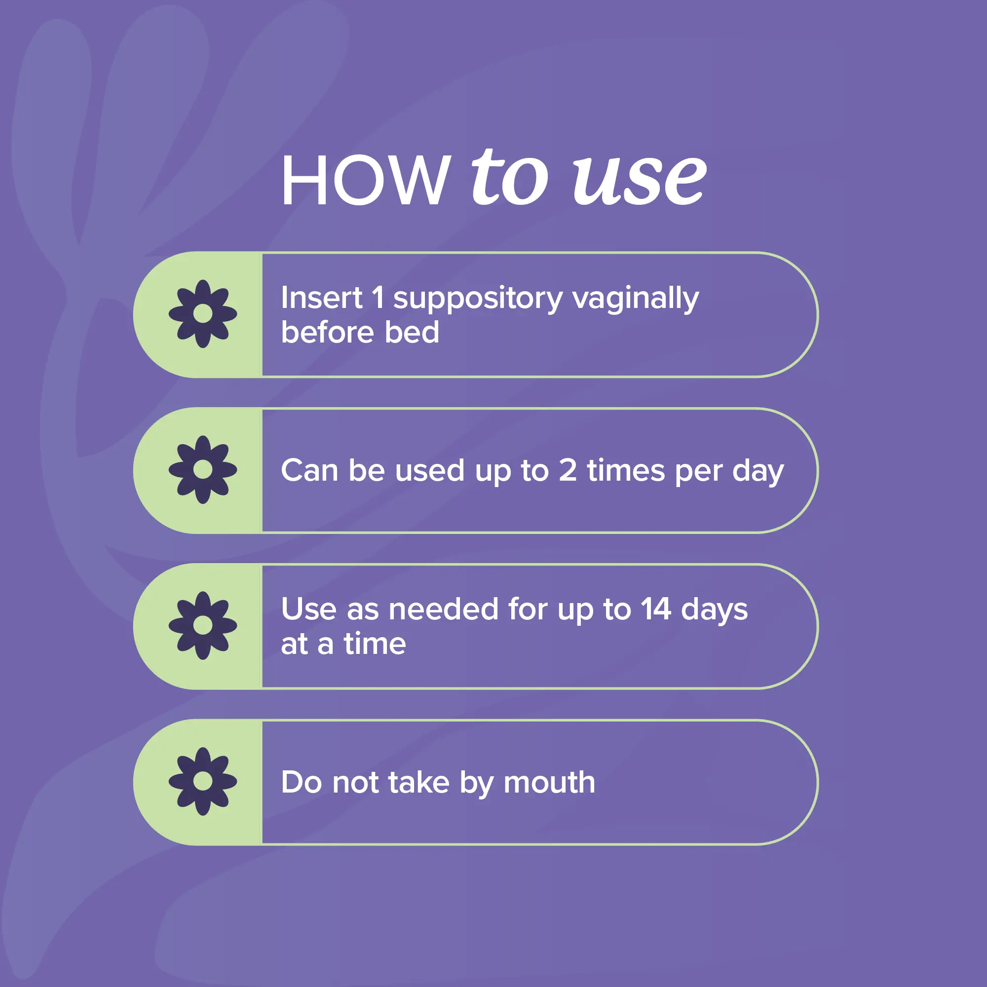 EASY-TO-USE: Simply insert 1 vaginal suppository at bedtime for 7 nights, or as needed for up to 14 consecutive days. Vaginal boric acid can be used twice per day, if necessary. Do not take orally.