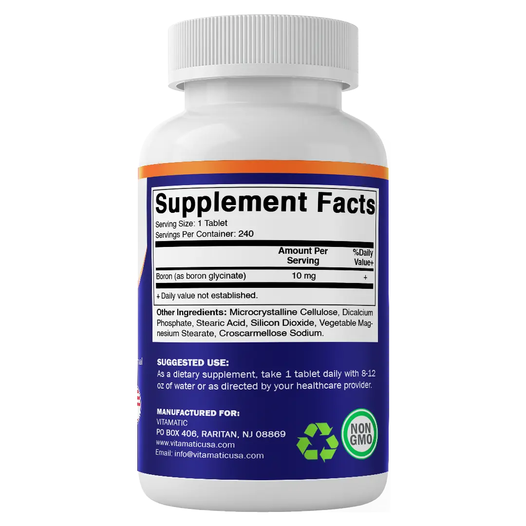 Boron glycinate supports hormone balance, bone health, and connective tissue. This non-GMO and gluten-free supplement is free of sugar, starch, soy, yeast, corn, wheat, egg, artificial color, flavor, and preservatives. Each tablet contains 10 mg of Boron mineral, providing 240 servings per container.