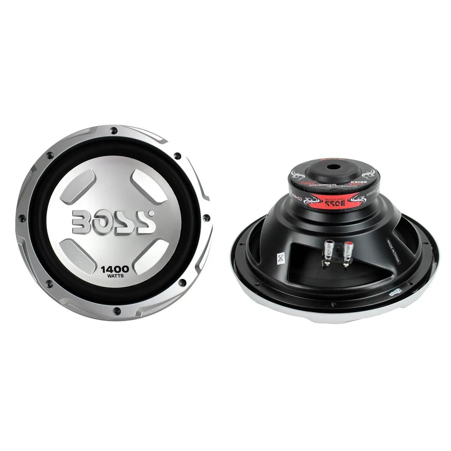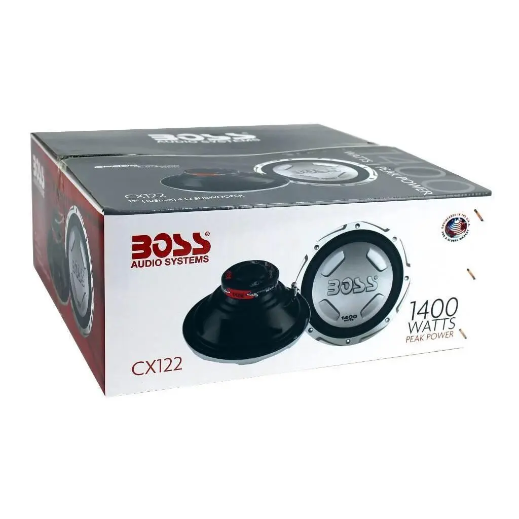 Give your car's audio system extra bump with these Boss CX122 Subwoofers. Offering a 1400 watt max and a 700 watt RMS per sub, these Boss CX122 subs have a heavy-stamped steel frame, single 4 Ohm voice coils and a custom-tooled injected cone. The Boss CX122 subs have a mounting depth of 4-1/8" and are 12". ![alt text][1] [1]: https://www.vminnovations.com/sys/resource.ashx?guid=6088617e844b4420a69def16beba86bb