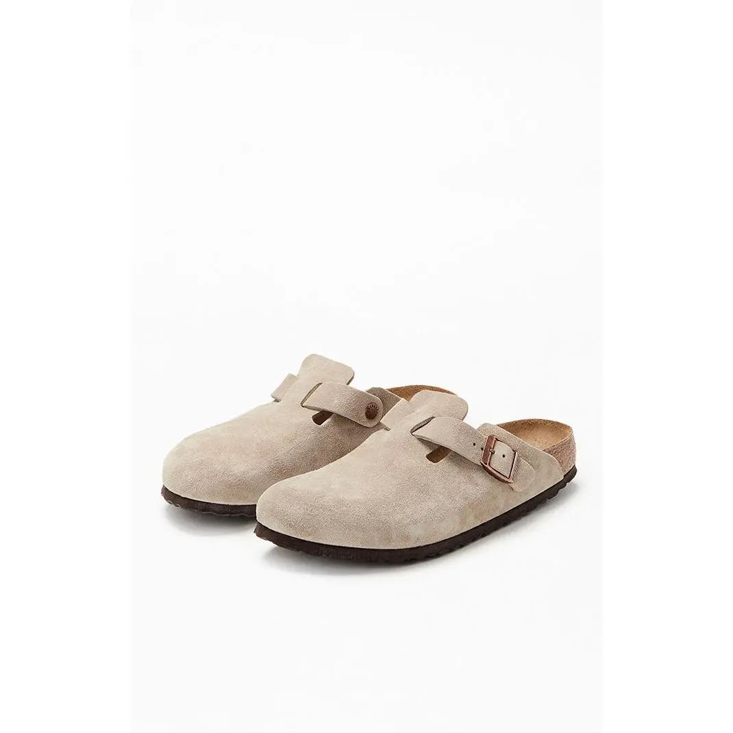 The Women's Taupe Boston Soft Footbed Clog from Birkenstock are the most sought-after clog, adding a fashion-forward edge to any style. Crafted from velvety suede for timeless appeal, they feature an adjustable strap and a soft footbed with an additional foam layer for extra cushioning and all-day support.