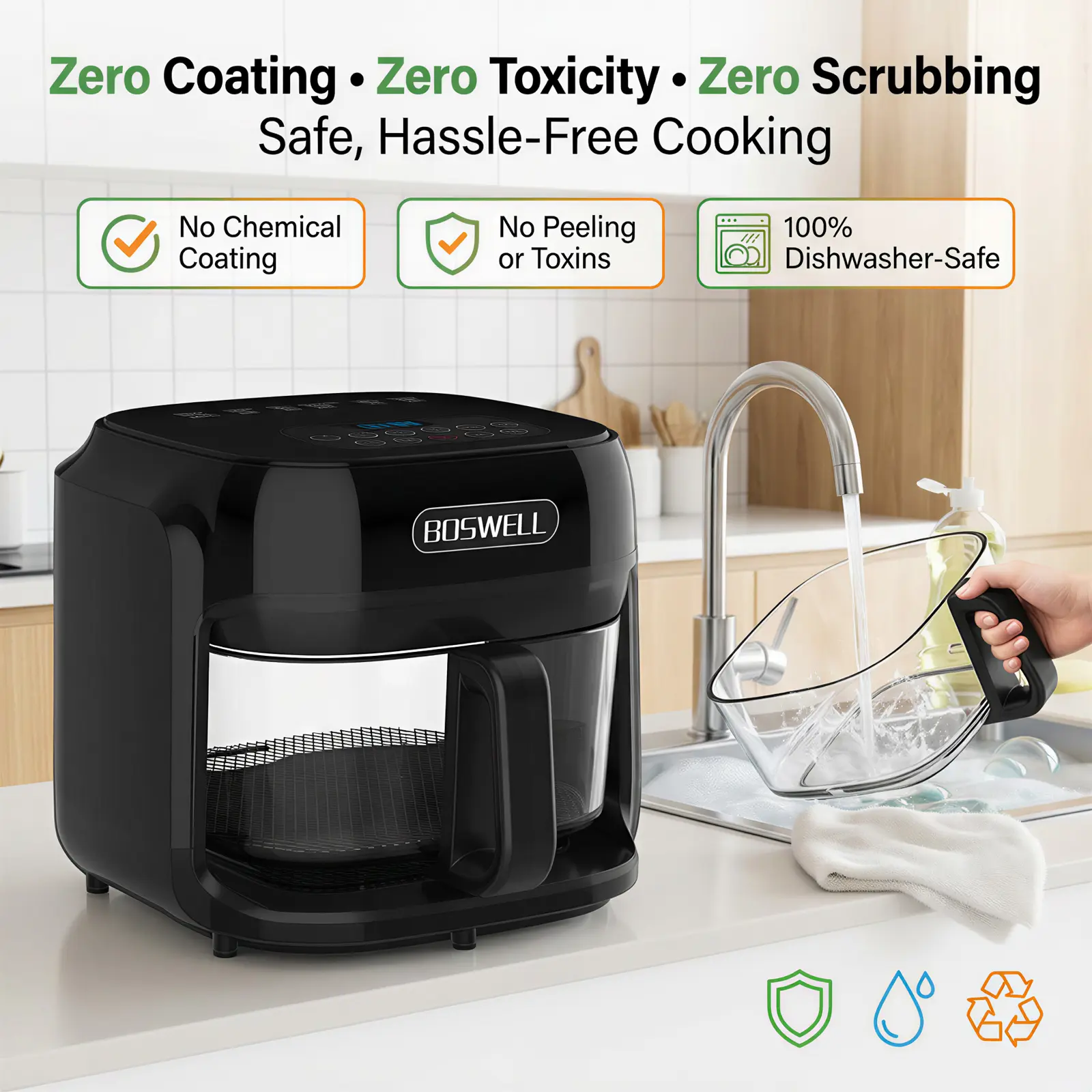The premium heat-resistant glass body allows you to watch food turn golden without opening the lid, preserving heat and shortening cook time. Perfect for monitoring doneness of fries, chicken, seafood, pastries, and family dishes—what you see is exactly what you get.