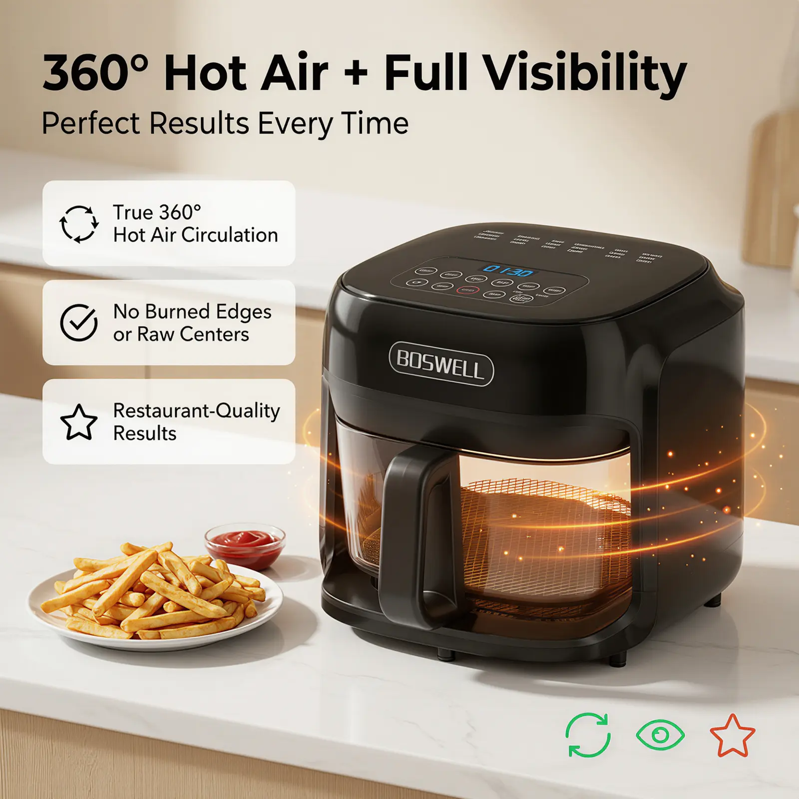 「360° Hot Air + Full Visibility for Perfect Results」