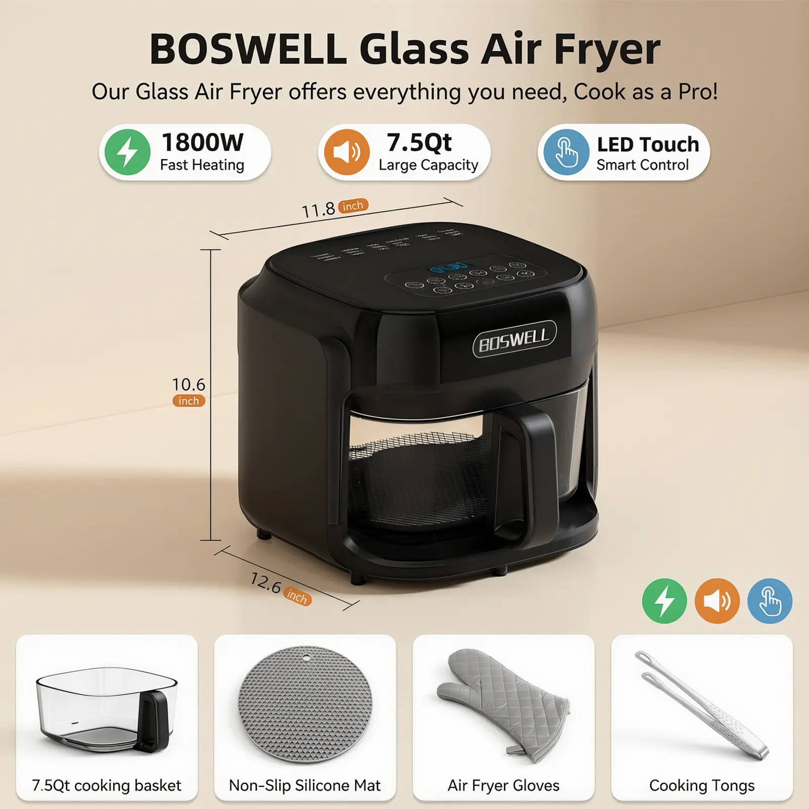 Our upgraded 7.5QT Glass Air Fryer uses true 360° hot air circulation to cook food evenly—no more burned edges or raw centers. Unlike traditional drawer-style air fryers, the transparent bowl lets you see everything as it crisps, helping you prevent overcooking and achieve restaurant-quality fries, wings, veggies, and more.