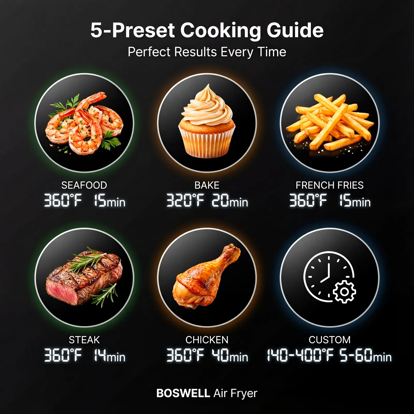 The generous 7.5QT capacity handles family meals, party snacks, and meal prep with ease—larger than most 6QT models. Features 5 one-touch presets (Fries, Steak, Chicken, Seafood, Bake) plus manual controls with a 60-min timer and up to 400°F for full cooking flexibility.