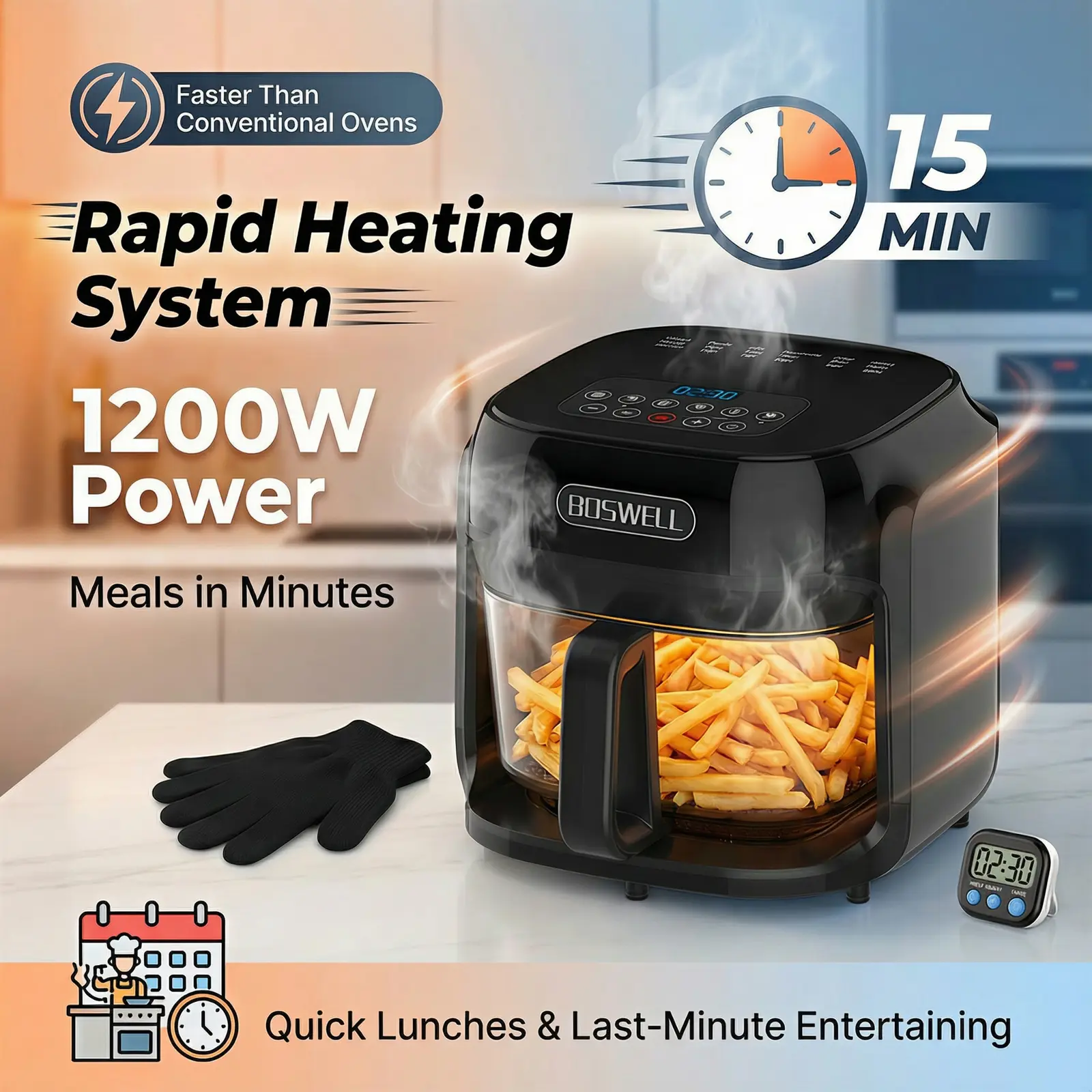 The powerful 1200W heating element preheats faster than conventional ovens and many competitor models. Meals cook in minutes—not half an hour—making it ideal for busy weeknights, quick lunches, and last-minute entertaining.