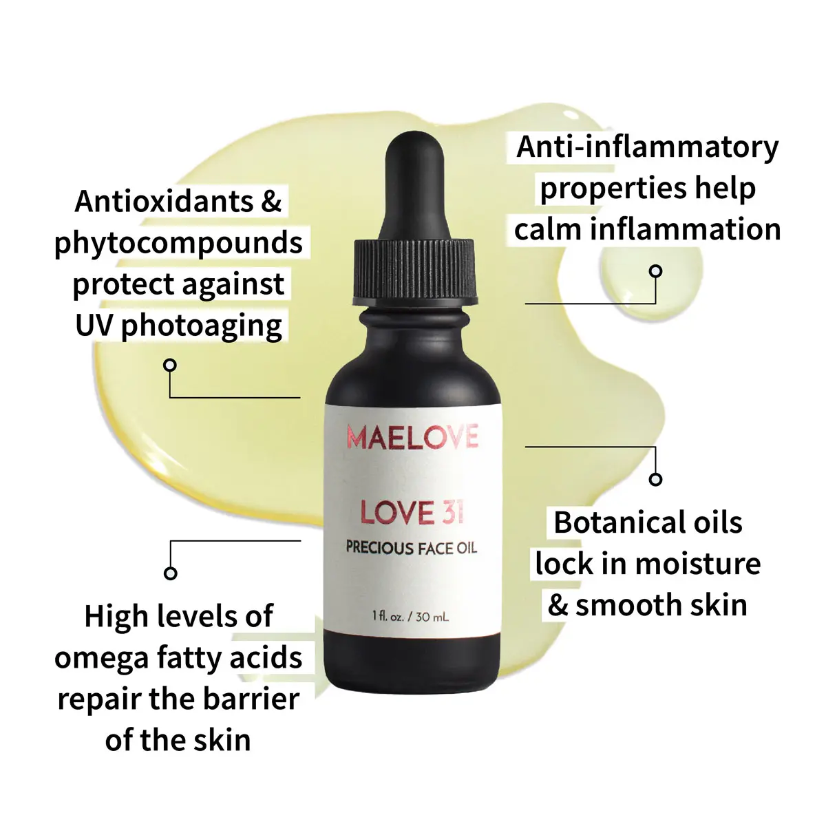 Love 31 is a luxurious facial oil that uses a decadent blend of nature's most effective oils. With anti-inflammatory, antioxidant, antimicrobial, and healing properties, this nourishing formula is the ultimate skin indulgence.