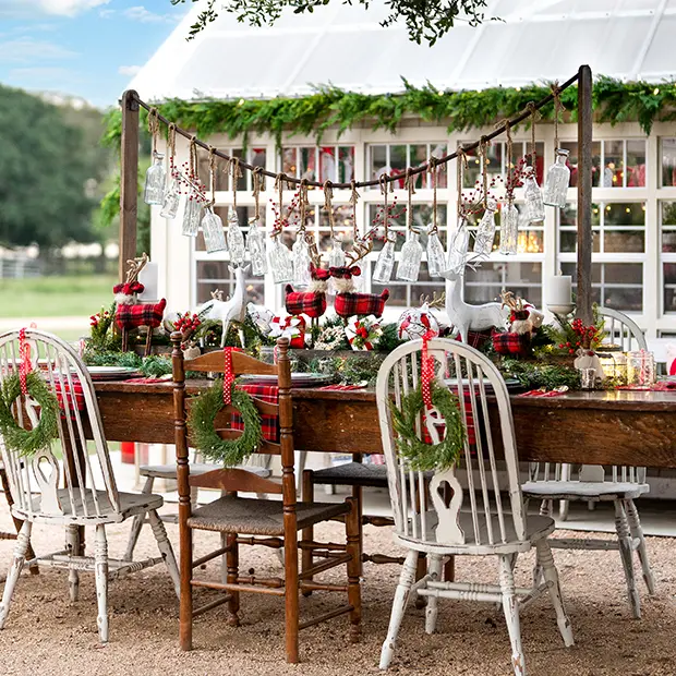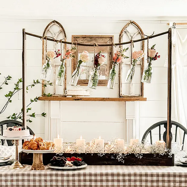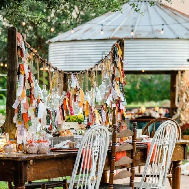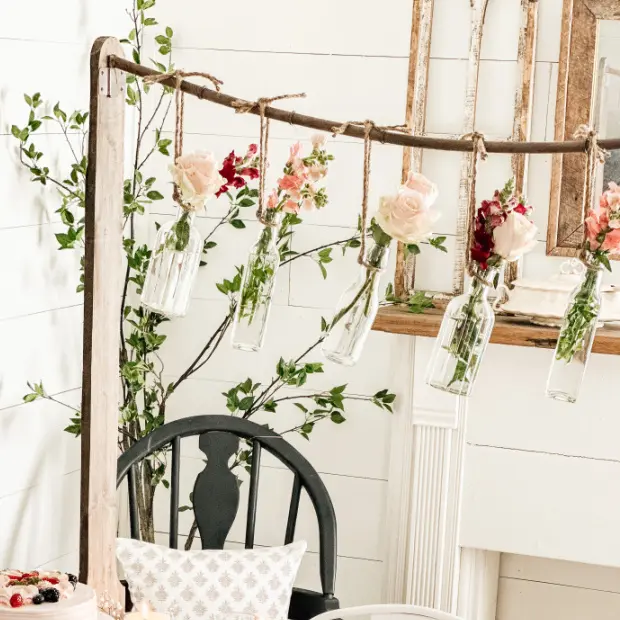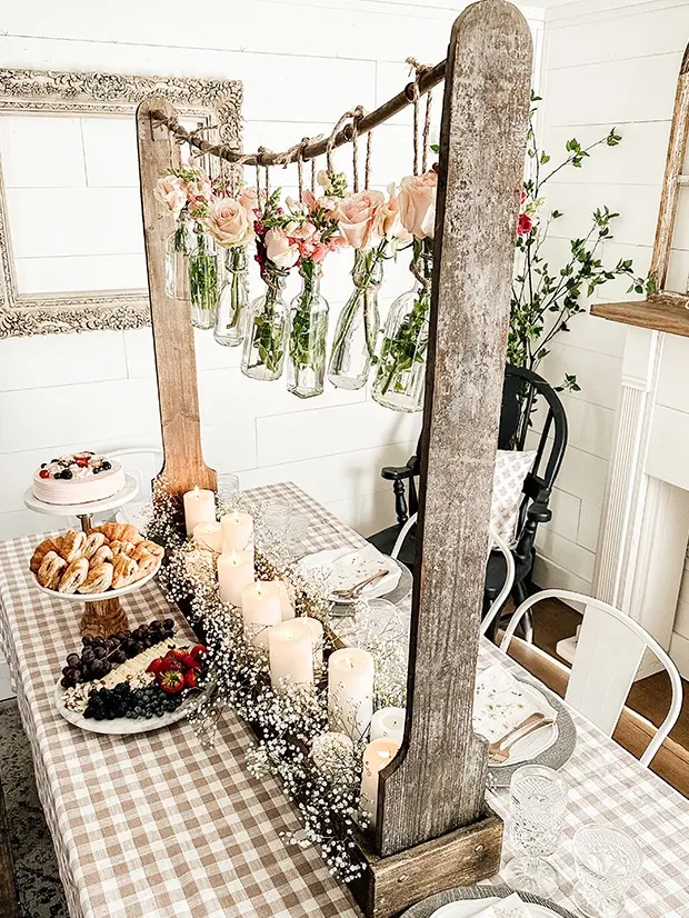 This Bottle Garland Vase On Wooden Centerpiece is not only beautiful but also functional. It allows you to showcase fresh flowers or greenery while keeping them organized and easily accessible.