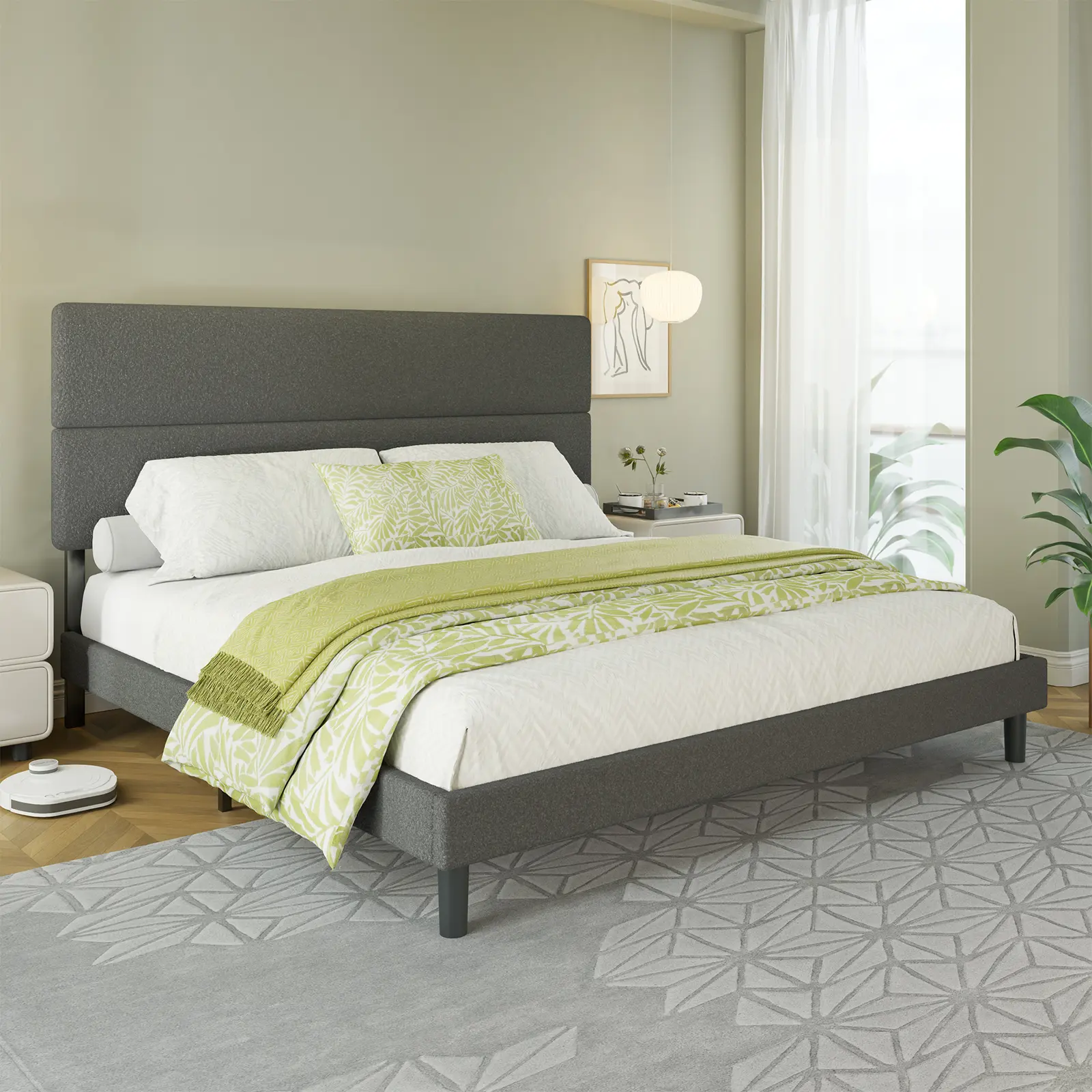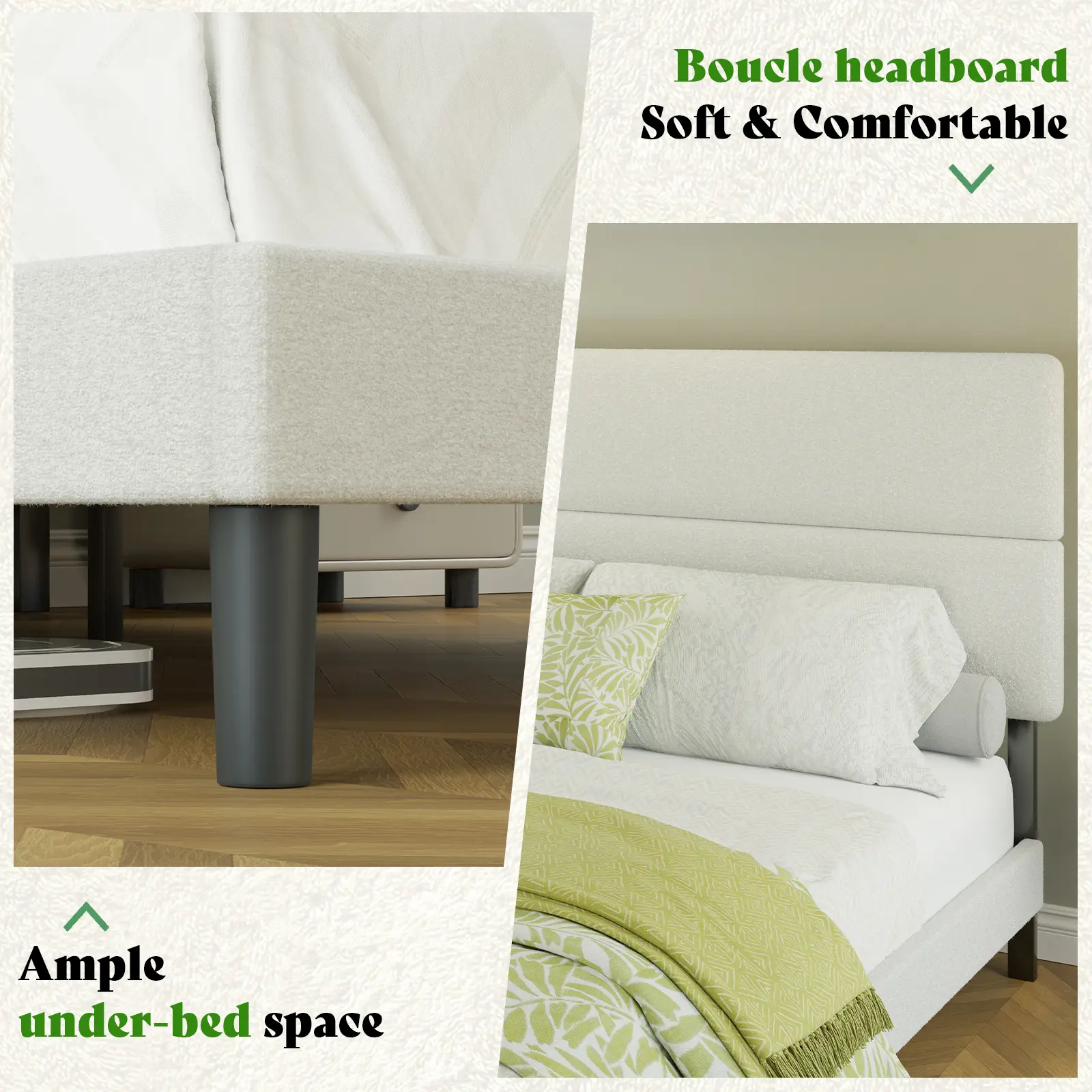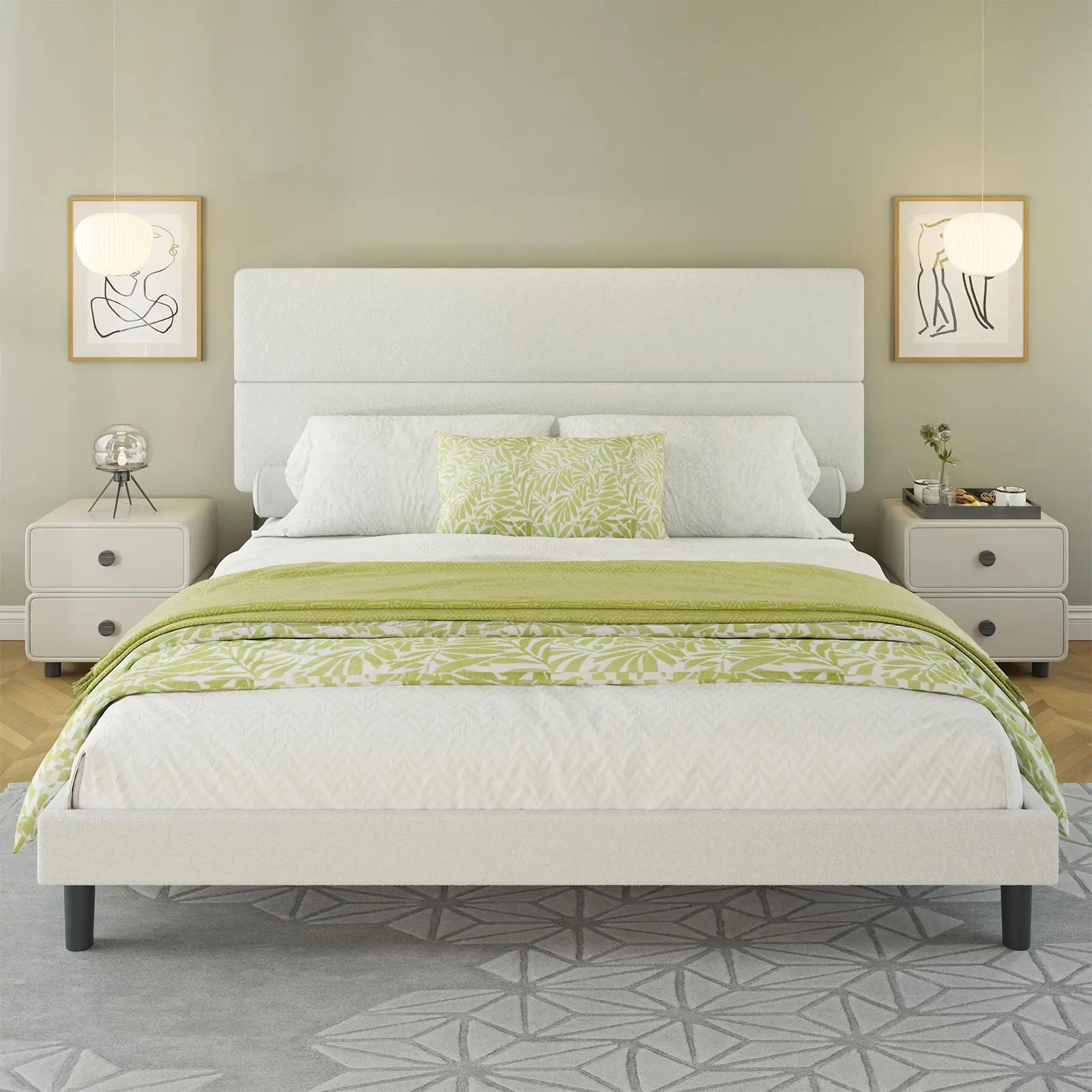 ·【Minimalist Style】The platform bed pulls you in with its sharp simplicity and round corners, offers a sleek, sophisticated and stylish addition to your bedroom's decor with its Boucle fabric cover.