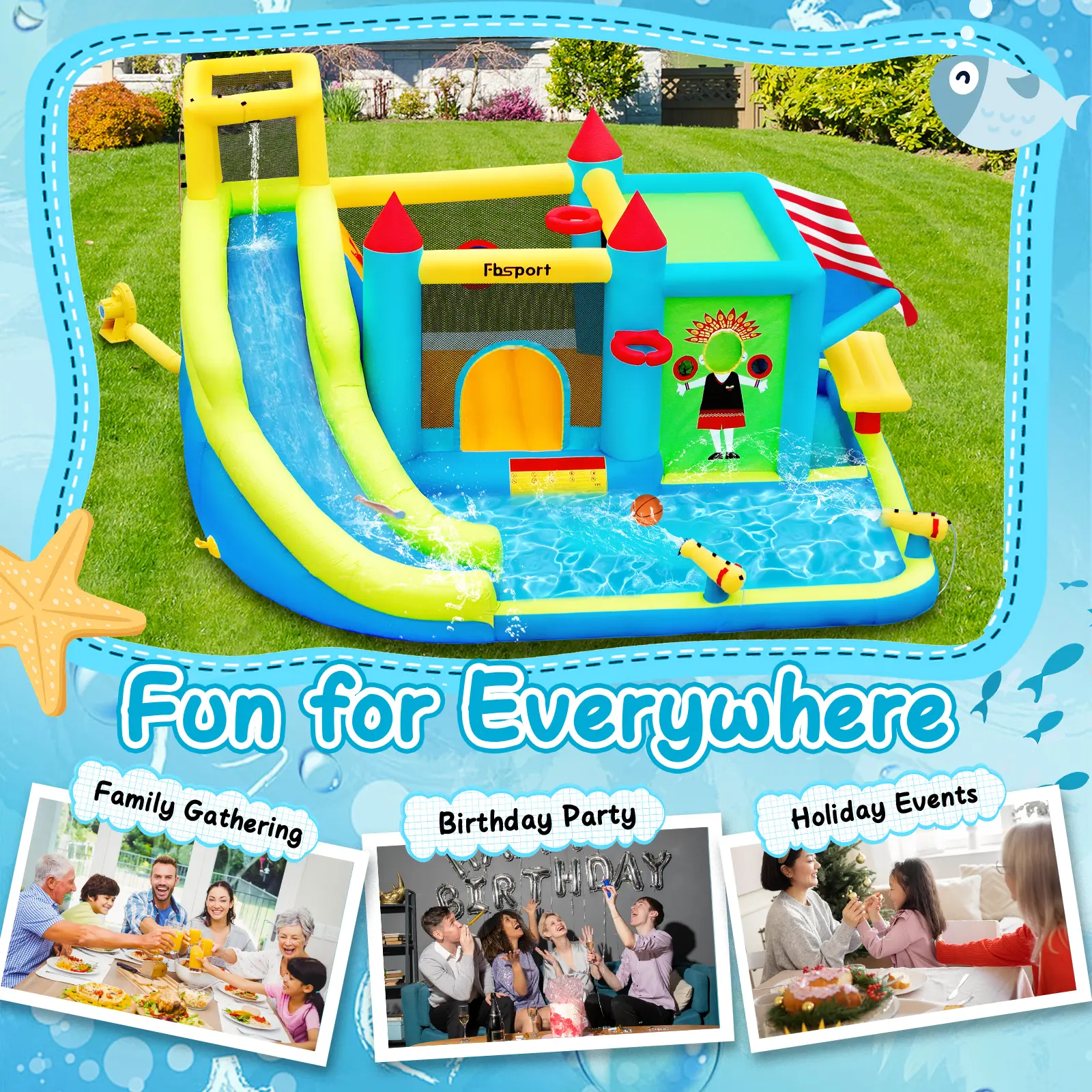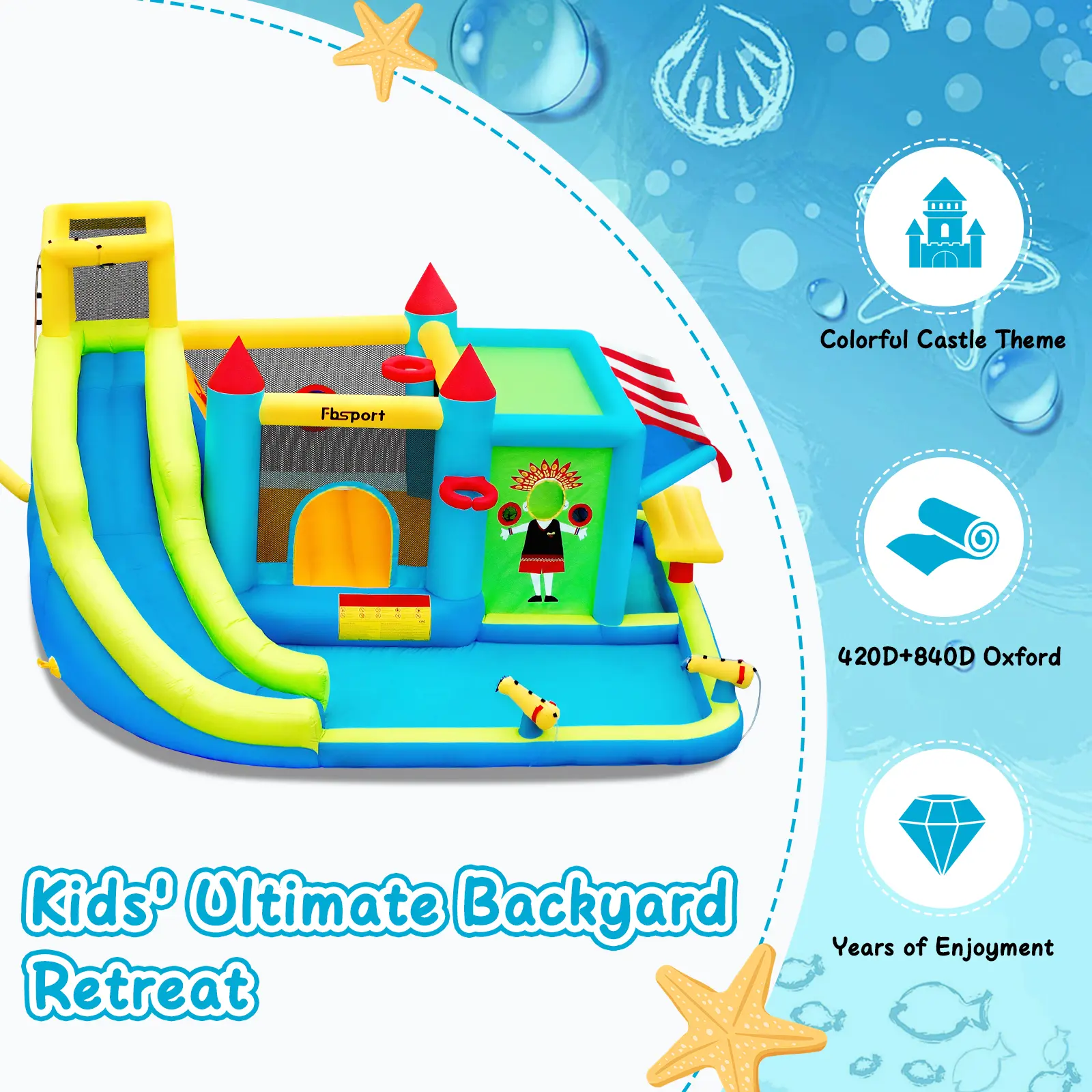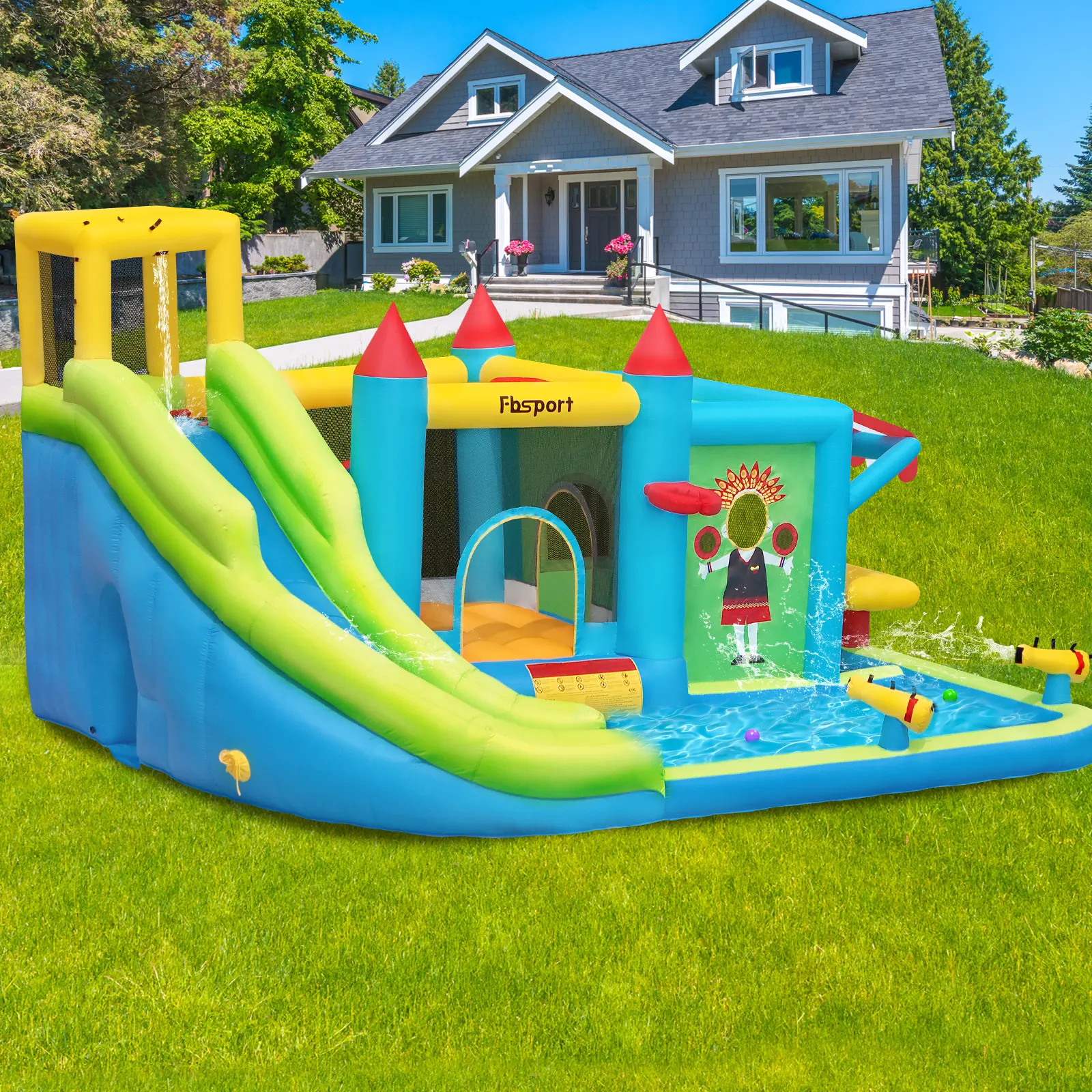 ·【10-IN-1 WATER SLIDE BOUNCE HOUSE】This 10-in-1 water bounce house features a variety of entertainment zones including long slide, huge splash pool, bounce area, two water cannon, climbling wall, two baskterball hoop, sprinklers, tunnel, funny photography part, pitching games and a market stand with sunshade for pretend play, which take your kids play party to the next level.