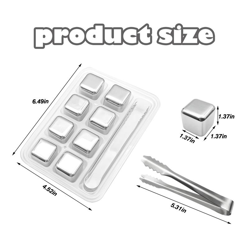 Without Dilution and Durable - The whiskey stone keeps your drinks stays cold, allowing you to get rid of the ice that will dilute your drinks and maintaining the rich taste of your favorite whiskey. The ice cube are also reusable that can be used many times for meeting your needed Food-grade Safety Guarantee - The whiskey stones are made with high-quality 304 stainless steel that are conform with food-grade standards, ensuring it safe and without any harmful chemicals into your drink Easily Use and Clean - The whiskey stone comes with a non-slip ice tongs and an ice freezing plastic storage box for you usage easily and store conveniently. You also can effortless clean and maintenance it for its smooth surface, allowing you enjoy a convenient experience Package Contents - Apart from having 8 counts reusable whiskey stones, the whiskey stones gift set also includes an ice tongs and an ice freezing plastic storage box ensuring you are easily use and conveniently to store and carry