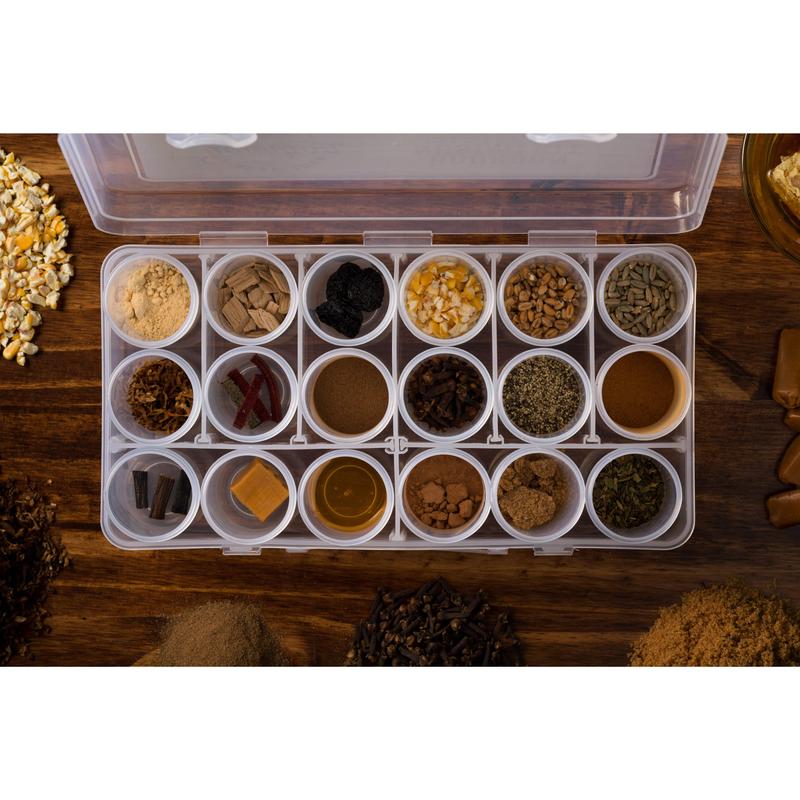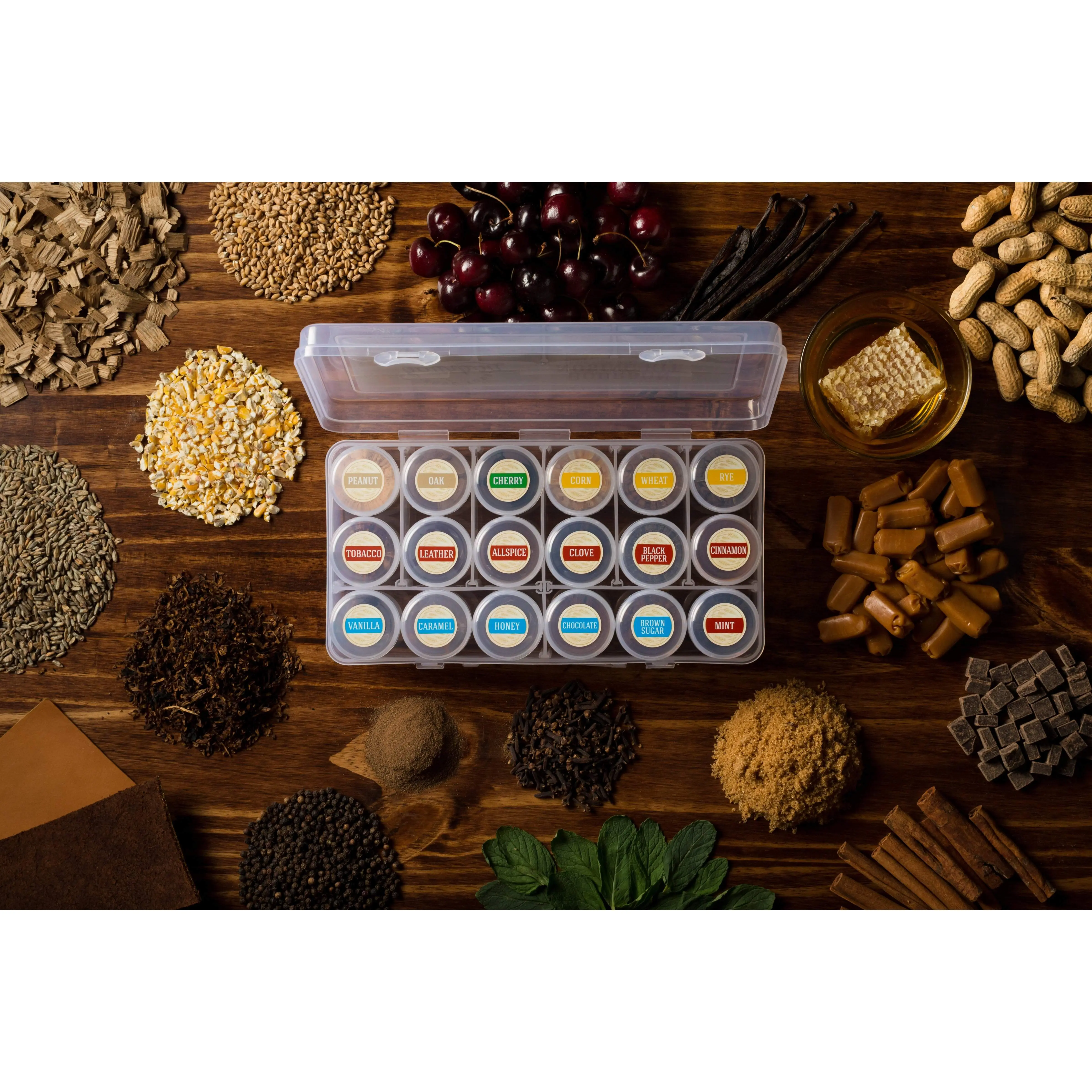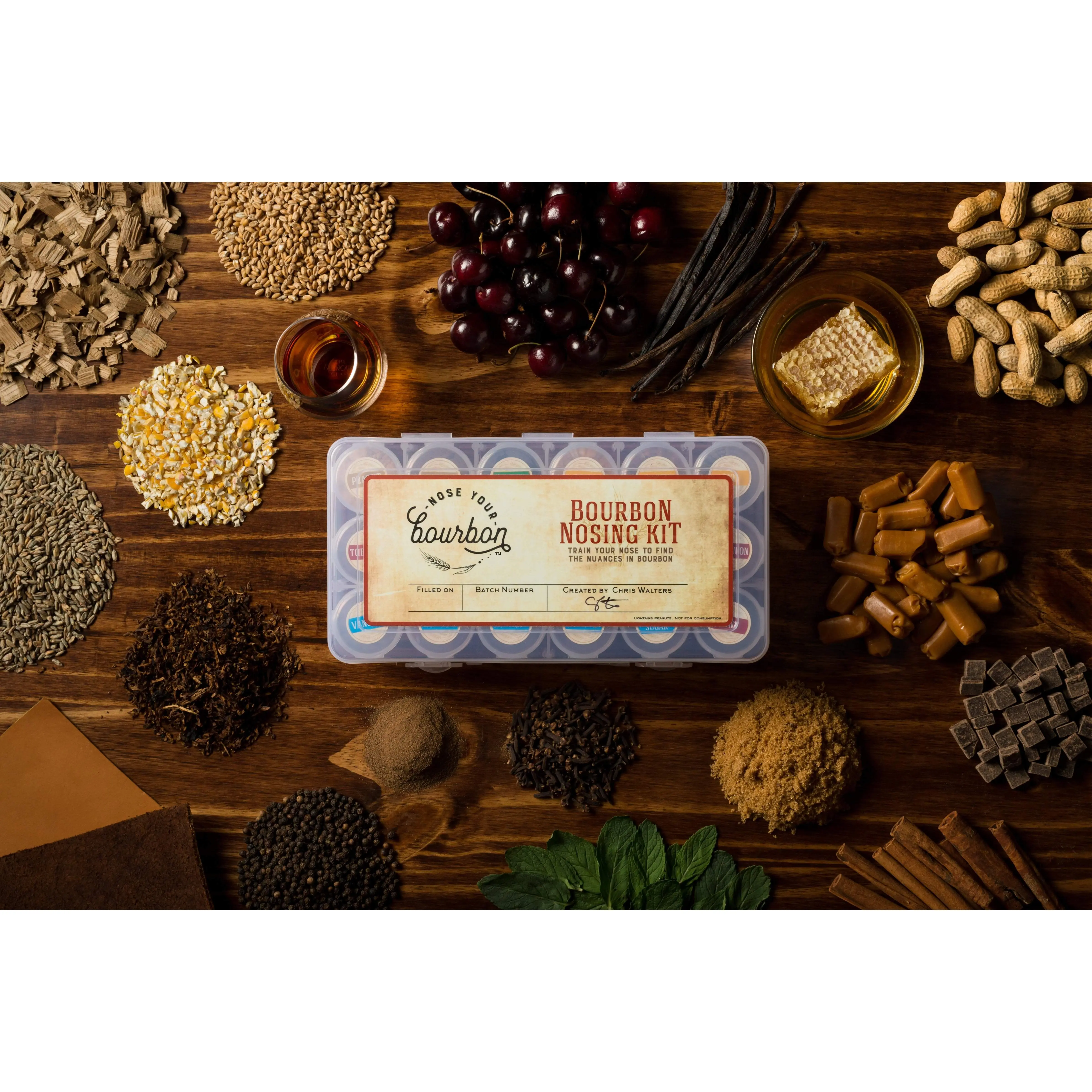 Do you roll your eyes when you read reviews that note "dark cherry, brown sugar, and leather," and think, there is NO WAY that someone is tasting all of that in their bourbon? We did too, until we realized that it was simply a lack of experience, and that we could train our nose to find the nuances in bourbon. Sensory scientists have proven that over 80% of what we taste comes from what we smell, and that's this bourbon nosing kit is extremely helpful in your enjoyment of fine bourbon. By simply training your nose to become more familiar with these aromas, you'll be able to more easily detect them in a glass of bourbon.How it works:- Pour some bourbon in a glass and swirl it around gently. - Nose (smell) one of the elements, then nose your bourbon.- Take a small sip and “chew” the bourbon around in your mouth for 5-10 seconds before swallowing. - Nose the element and the bourbon again. The aromas present should be more amplified now. - Take note of what aromas you find in the bourbon you’re nosing. If it smells sweet, can you get more specific? Maybe it’s more like vanilla, honey, or brown sugar. If it's spicy, is it a cinnamon spice or black pepper spice? - Repeat the process with each element to see what other nuances you can find in your glassOther nosing kits cost hundreds of dollars and use synthetic aromas made in a lab. These kits are made with the REAL ingredients for the most authentic aroma. The elements in this kit represent the wood, grain, sweet, spice and fruit/floral categories commonly found in a bourbon tasting wheel. Includes 18 elements in screw top containers and instructions for how to get the most out of the kit, all held in a convenient travel case. Elements included:Vanilla (bean)Caramel Honey Cocoa (powder)Brown SugarCherry (dried)Tobacco (premium pipe tobacco)Leather (100% genuine leather)AllspiceCloveBlack PepperCinnamon Mint (crushed leaves)Peanut (powder)Oak CornWheatRyeContains peanuts. Not for consumption.Bring one of these kits to your next bourbon or whiskey tasting and take your conversations to the next level! "This is a great addition for any bourbon lover. Using this kit has helped me articulate what I am tasting in the bourbon. I would highly recommend them!" - Bobby C."This kit is great for those who enjoy bourbon and are looking to take that next step. It helps you identify specific elements in the nose and reconcile those with the tastes on your palate." Stuart G."If you are new to bourbon, or a long time lover of it, this kit will help expand your palate and really help you identify what you are drinking! I highly recommend this product." Scott M."Love this kit. I've never been fantastic at identifying specific elements in a bourbon, and while I'm still not awesome, this kit is a fun way to improve." Chad J.