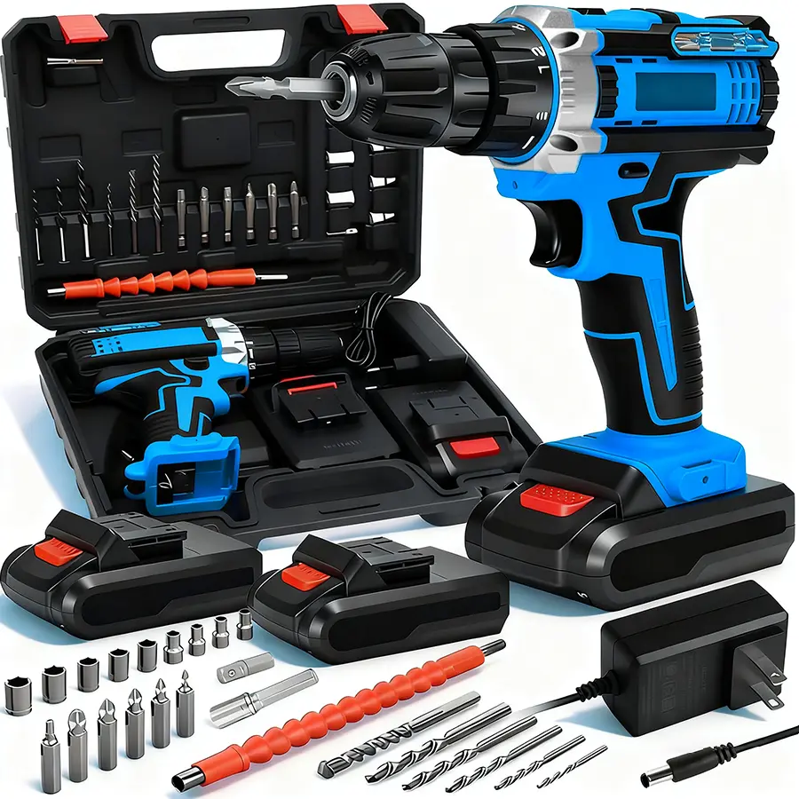 Complete Set with Portable Toolbox: Each drill kit includes an LED light, 2 batteries, a charger, and various drill and bits, all neatly stored in a durable toolbox for easy transport and storage. Whether you're working outdoors or doing home repairs, this drill set is your perfect choice.