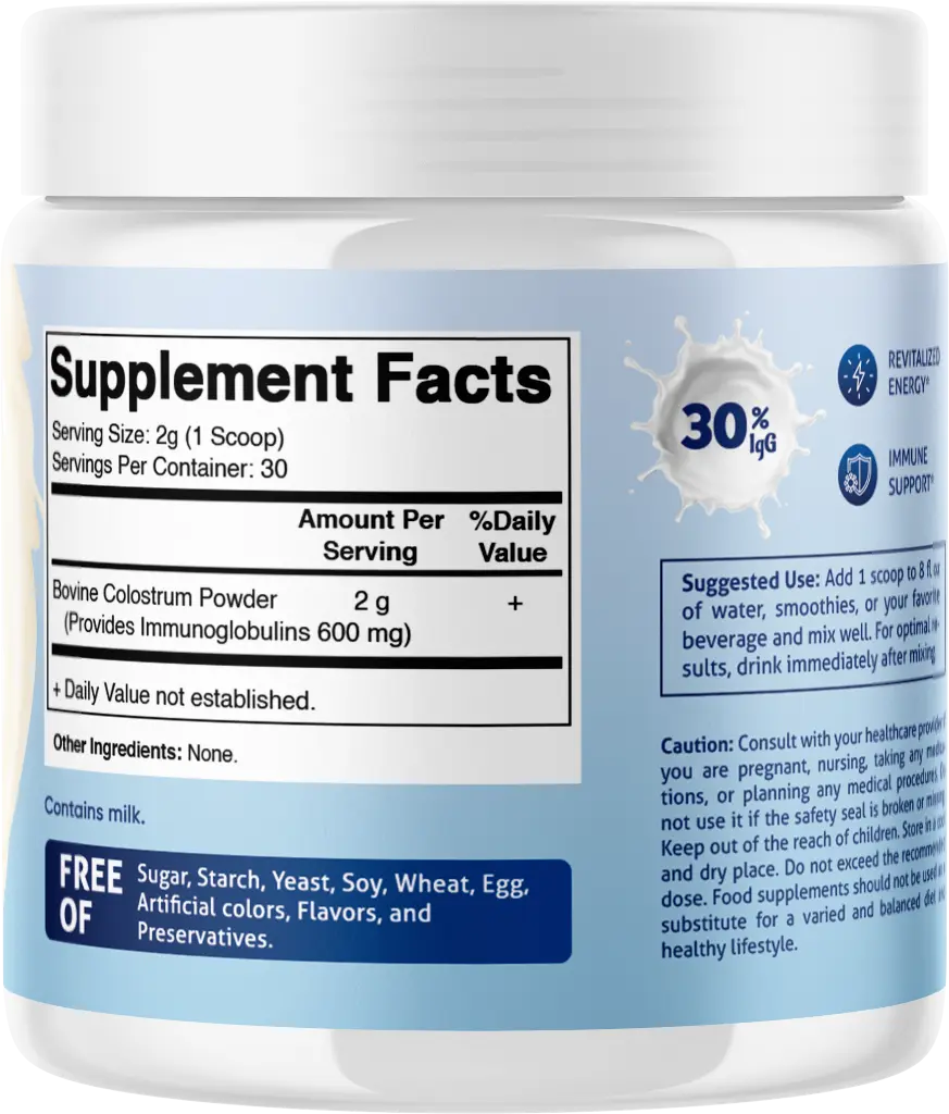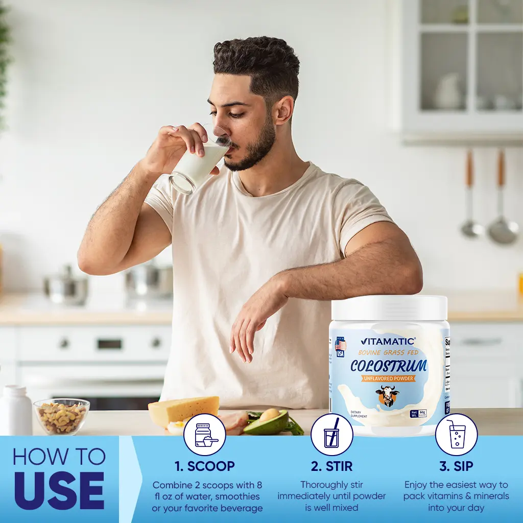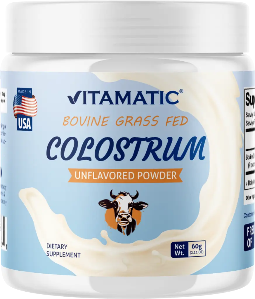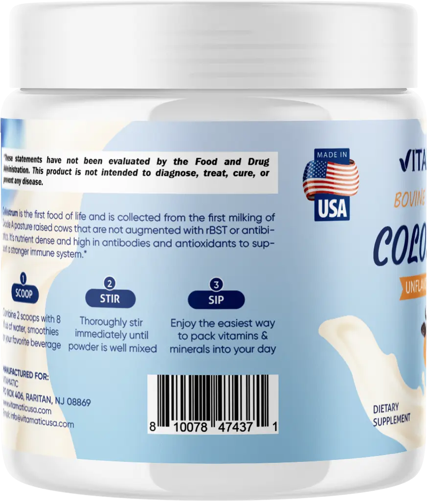 Elevate your health with Vitamatic Bovine Colostrum! This powder supports gut health, muscle recovery, and immune support. Sourced from sustainable, ethical farms in the USA, it's free of GMOs, gluten, soy, yeast, wheat, egg, artificial colors, flavors, and preservatives. Perfect for those seeking natural, wholesome ingredients.