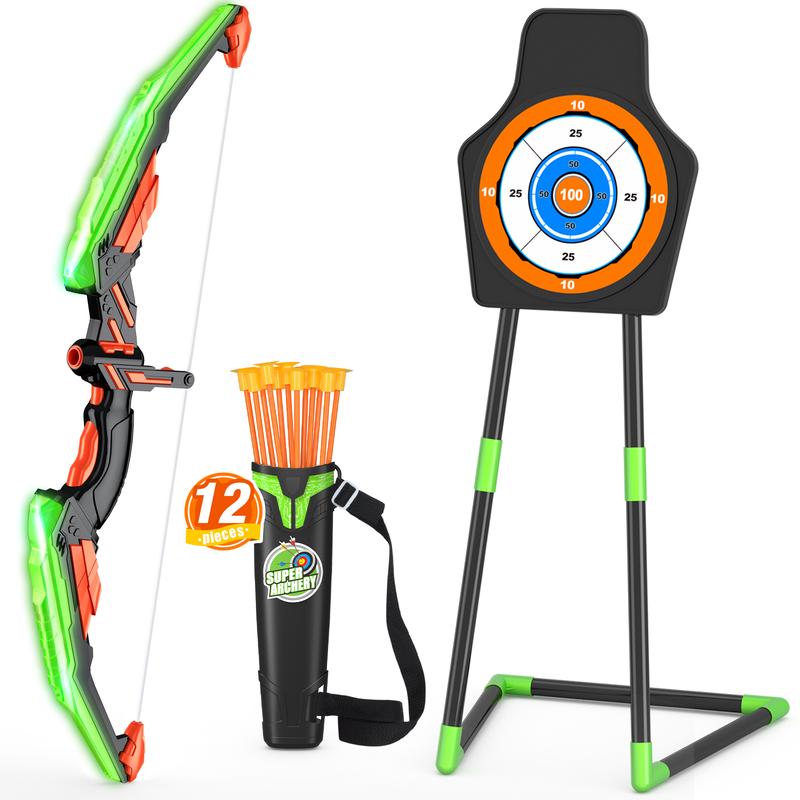 ·[LED Lighting Bow and Arrow Set] -Includes 1 Green bow with LED light (need 2*AA batteries - not included), 12 suction cup arrows, 1 detachable standing target (could switch to hanging target) and 1 carrying quiver. LED lights bow allows little archers to aim more accurately and play day and night.