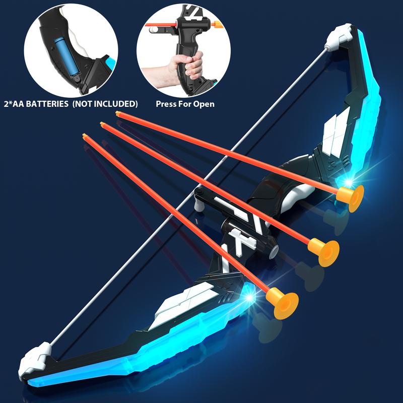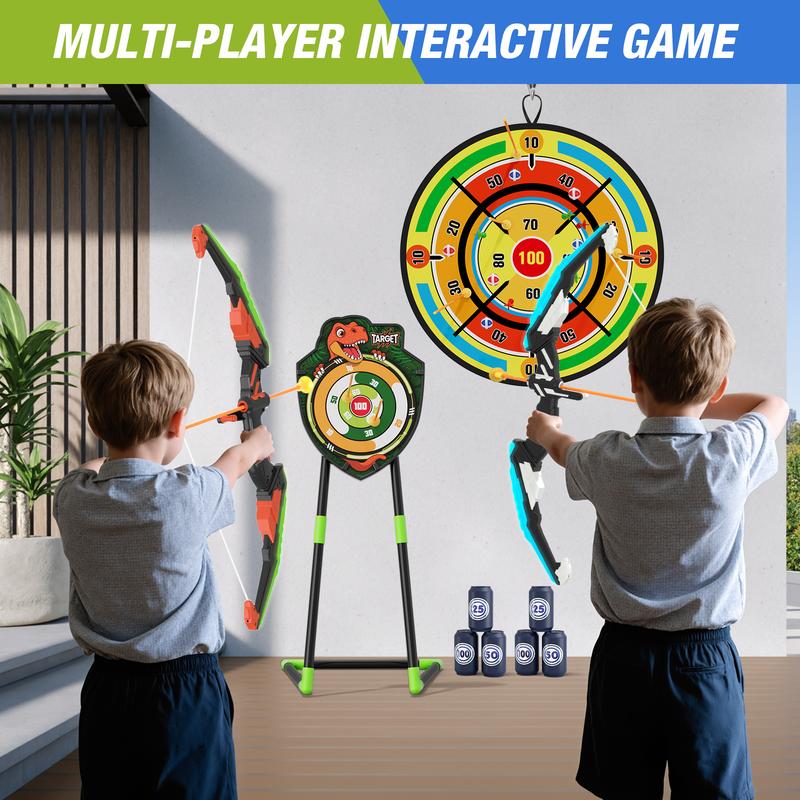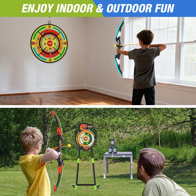 [LED Lighting Bow and Arrow Set] -Includes 2 bows with LED light (need 4*AA batteries - not included), 24 suction cup arrows, 1 large dart board (29inch), 1 detachable standing target (could switch to hanging target), 6 score targets, 6 sticky balls, 6 darts and 2 carrying quiver. LED lights bow allows little archers to aim more accurately and play day and night.