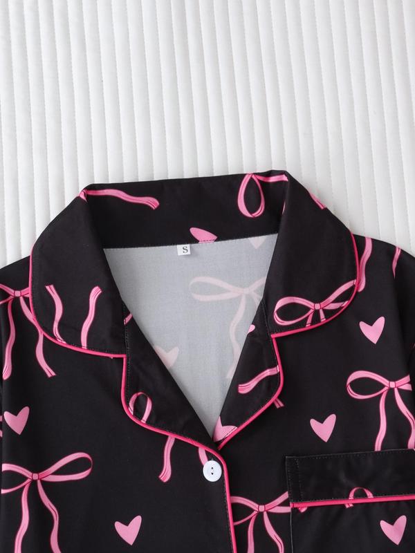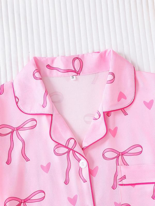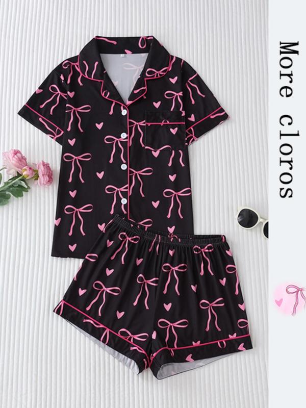 Women's Bow Print Short Sleeve Tee & Shorts Pyjama Set, Elegant Comfy Button Up Top & Elastic Waist Shorts Set, Ladies Sleepwear for All Seasons, Loungewear, Matching Pj Set, Womenswear, Pajama Set, Casual Comfy Pajama, Summer Sleepwear