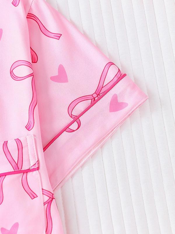 Women's Bow Print Short Sleeve Tee & Shorts Pyjama Set, Elegant Comfy Button Up Top & Elastic Waist Shorts Set, Ladies Sleepwear for All Seasons, Loungewear, Matching Pj Set, Womenswear, Pajama Set, Casual Comfy Pajama, Summer Sleepwear #nightwear #comfortwear #valentinesdaypajamas #toddlerpajamas #loungewearfinds #satinpajamas #teddybearpjset #holidaypjs #womenslingerieset #printedpajamas