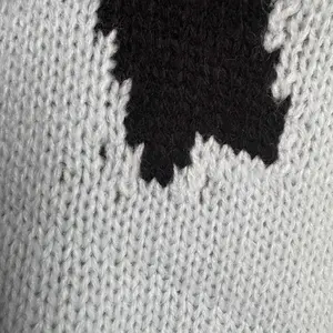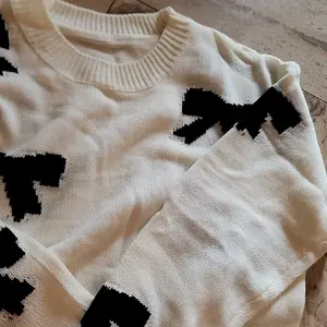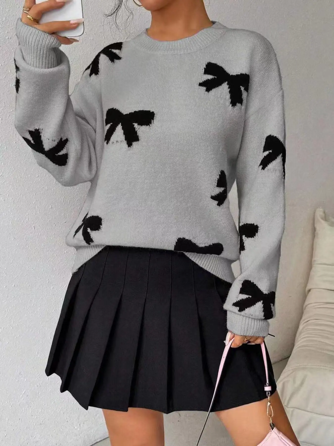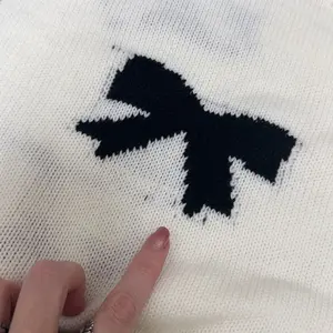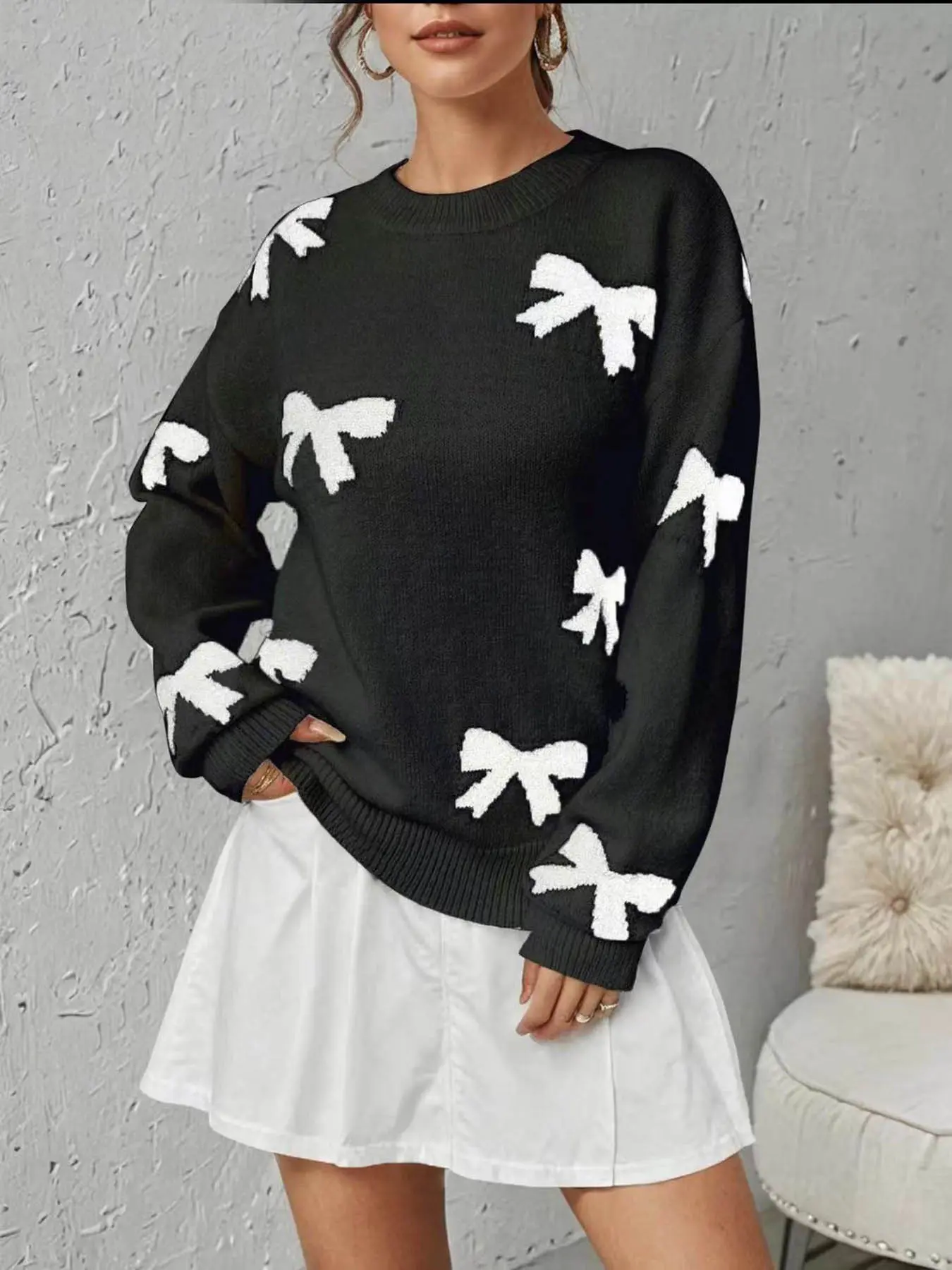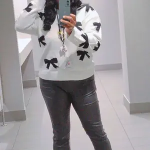 Cute sweater and true to size. However, the threading/yarn for the bows is misplaced and it looks cheap with the black coming through the white. Typically, there is a backing on the appliqués so that it doesn’t come through but not on this sweater.
