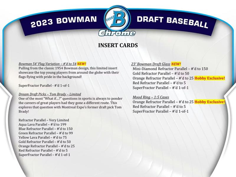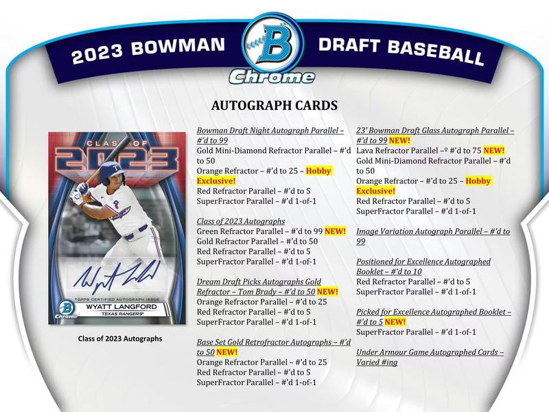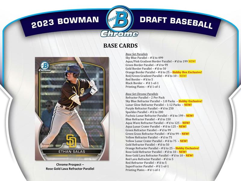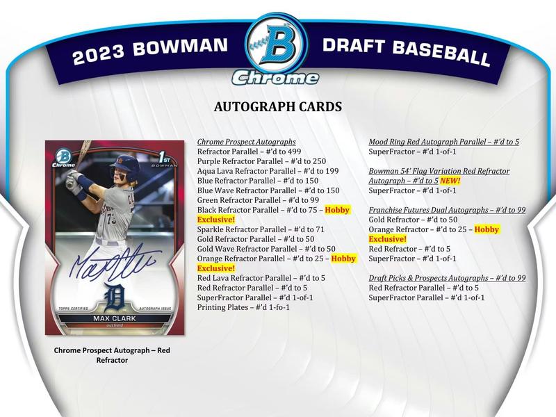 Look for the 1st Bowman Cards of Wyatt Langford, Paul Skenes, Matt Shaw, Max Clark, Colt Emerson, Jacob Wilson, Josue De Paula, Enrique Bradfield, Hurston Waldrep, Rhett Lowder, Noble Meyer, Tommy Troy, Bryce Eldridge, Brayden Taylor, Dillon Head, Jonny Farmelo, Tai Peete, Cole Carrigg, Chase Davis, Colton Ledbetter, and Mac Horvath!
