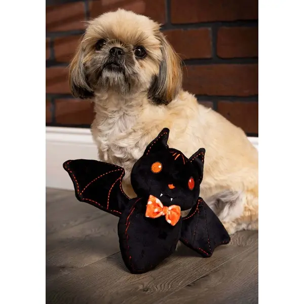 Give your natural-born hunter an adorable foe with this exclusive Bowtie Bat Pet Squeaky Toy! The high-quality chew toy is made of black polyester and embroidered with orange details. The face is detailed with tiny white "fangs" and the neck is sewn with a polka-dotted orange bow tie. When the body is pressed, it makes a squeaking noise.