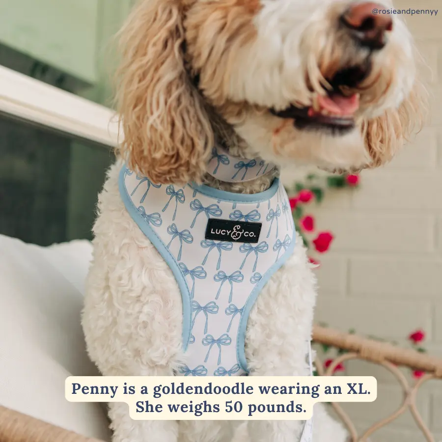 Such blue-tiful bows! Made with water-repellant neoprene, this harness features two prints in one and it's easy to swap to the other side for a brand new look! Explore our reversible harnesses for an easy-care for fit that moves with all of your pups natural wiggles and shakes.