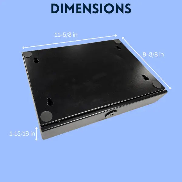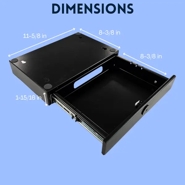 The Box-ie is a small, effective under-surface locking storage solution. It securely stores small valuables, ideal for small spaces and areas with desk frames. Created for versatility, it fits most worksurface sizes. When closed, it measures 12"W x 8"D x 2"H. Fully open, it measures 12"W x 17"D x 2"H.