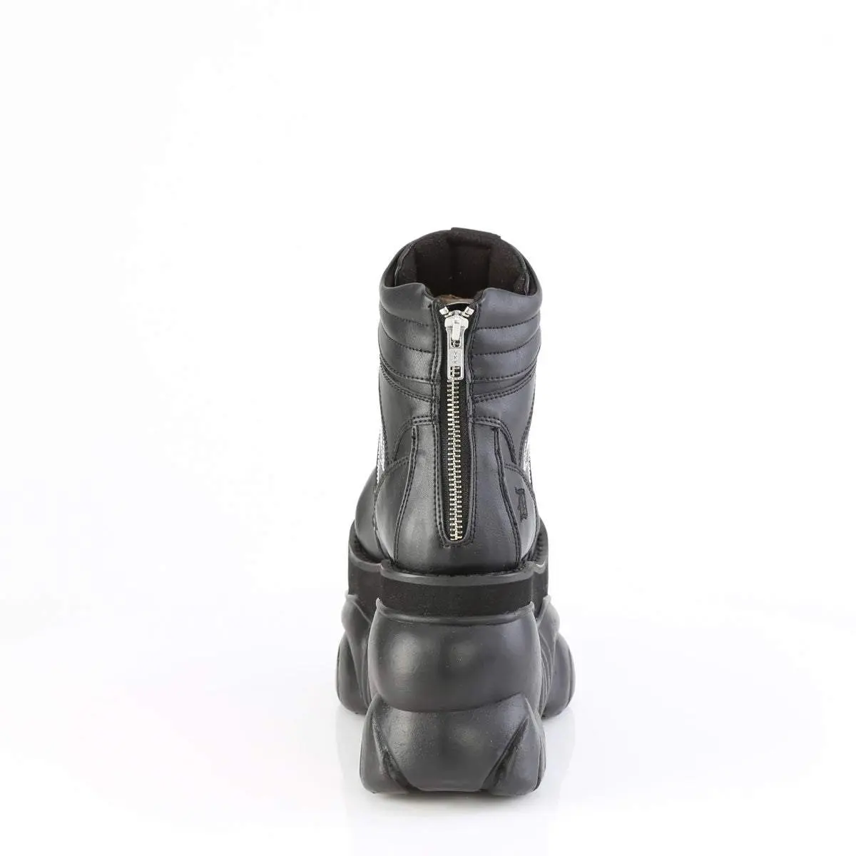 The Demonia Men's Boxer-70 Mid-Calf Boot is a striking choice. It features a 3" (76mm) platform ankle design. The ornamental front straps add a unique touch. A padded collar ensures comfort. The boot includes embroidered spider web side panels for a distinctive look. Perfect for those who appreciate detailed craftsmanship.
