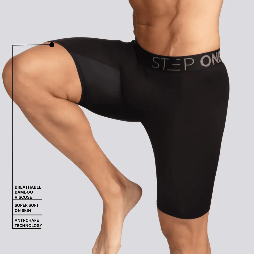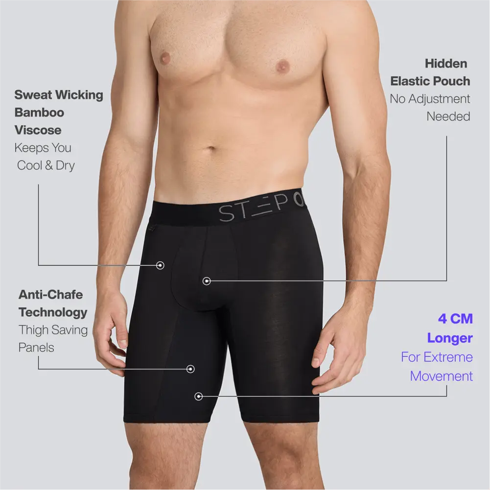 Our new Boxer Brief Sport range has all the Step One benefits you know and love, with added features designed alongside world-class athletes to meet the specific needs of sportspeople.The Boxer Brief Sport range is 4cm longer in leg length than our boxer briefs, meaning they stay-put and won’t ride up even during extreme movement. Plus, longer UltraGlyde panels = zero chance of chafe!The fabric is the same breathable, organically grown bamboo that wicks away sweat and keeps you cool.The 3D elastic pouch ensures everything stays where it should, even during rigorous exercise.Love to move? Then you need Step One Boxer Brief Sport.