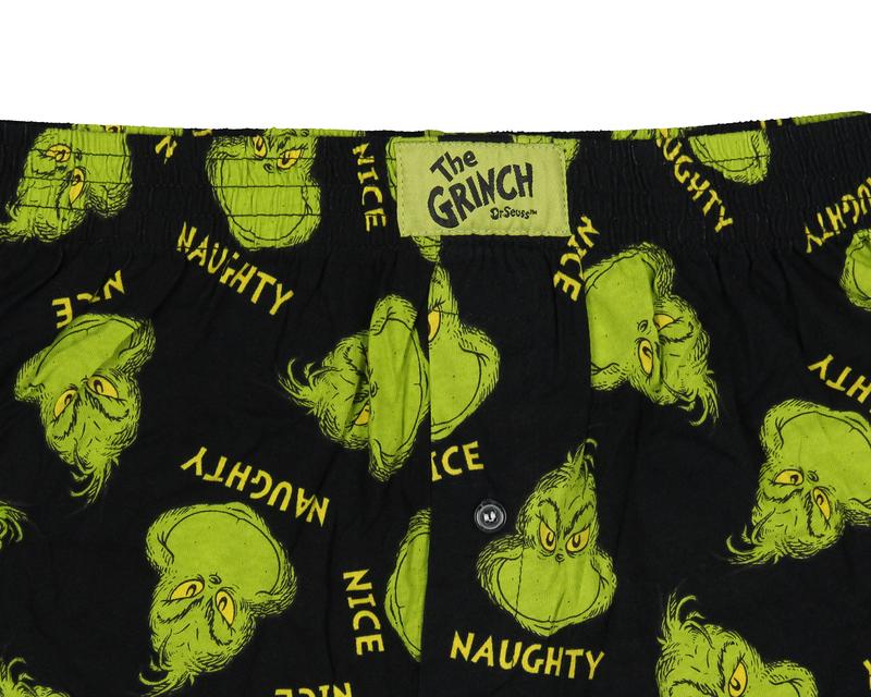 Get into the holiday spirit with these Dr. Seuss The Grinch boxers! Featuring an allover "Naughty and Nice" Grinch face design, these boxers add a playful touch to your sleepwear or loungewear collection. Made for ultimate comfort, they have a soft, stretchy elastic waistband that sits snugly without pinching, along with a convenient one-button fly. great for Grinch fans or anyone looking to celebrate the season in style, these boxers are a fun and cozy addition to your holiday wardrobe, blending festive mischief with everyday comfort. Festive allover Grinch design β Embrace the holiday spirit with these playful Dr. Seuss Grinch boxers, featuring a lively "Naughty and Nice" Grinch face print, ideal for anyone who loves the mischievous holiday classic Stretch elastic waistband β Designed with comfort in mind, these boxers come with a soft, flexible elastic waistband that adapts to your movements, making them ideal for lounging, sleeping, or casual wear Convenient button fly β Equipped with a functional one-button fly, these boxers offer practical convenience and ease of use, adding to their classic sleepwear style Durable quality β Made from quality materials, these boxers are built to last, resisting wear and tear for seasons to come, even after multiple washes Great for fans β The ultimate gift for any Dr. Seuss or Grinch fan, these boxers combine festive fun with all-day comfort. Ideal for cozy nights, holiday lounging, or as a playful addition to any Grinch enthusiast's wardrobe