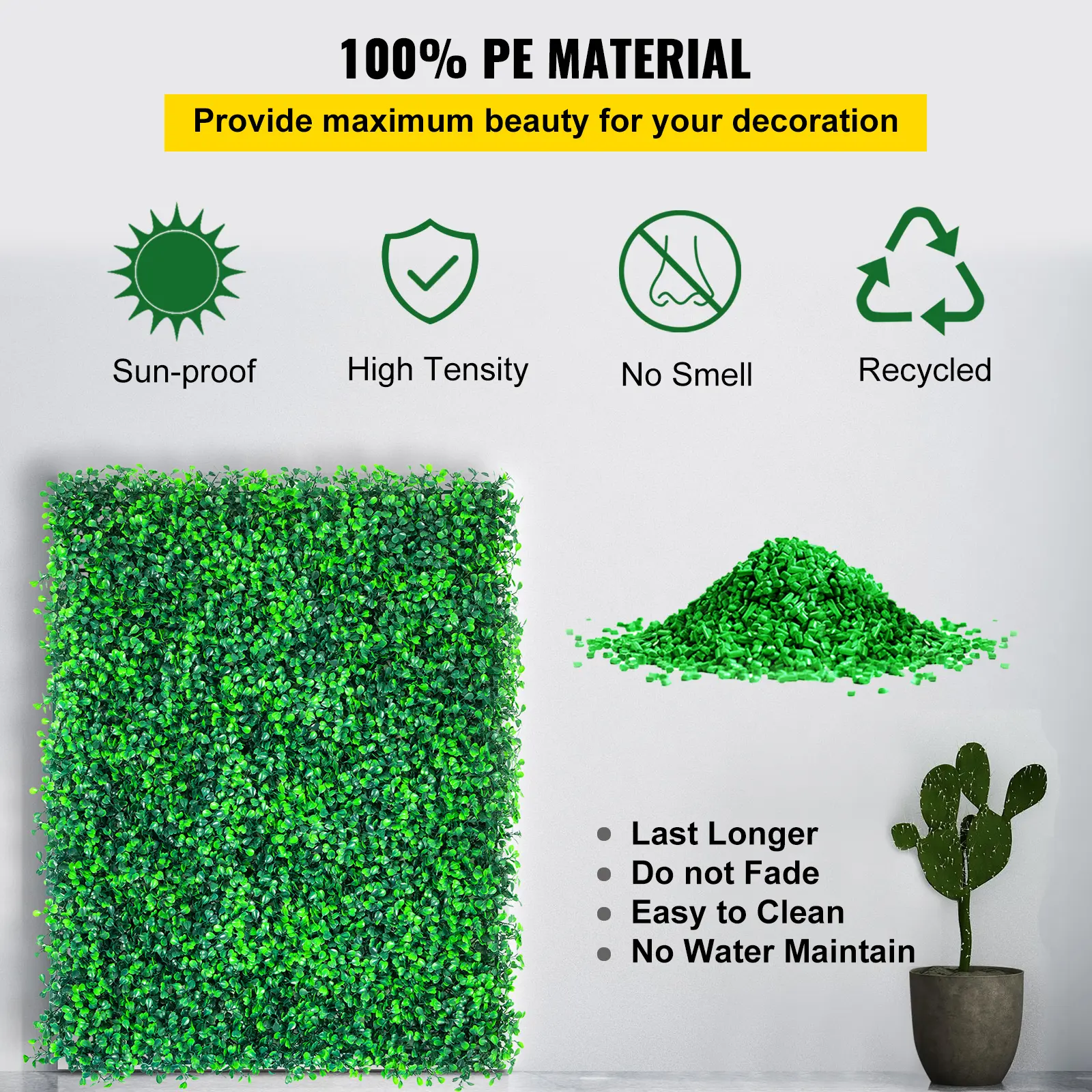 • Premium PE Material: With SGS certification. Boxwood hedge wall panels are made of new PE high-density polyethylene (HDPE) material for long last, no smell, low-maintenance, eco-friendly, and sunproof to maximum beauty of your decoration for both indoor and outdoor.