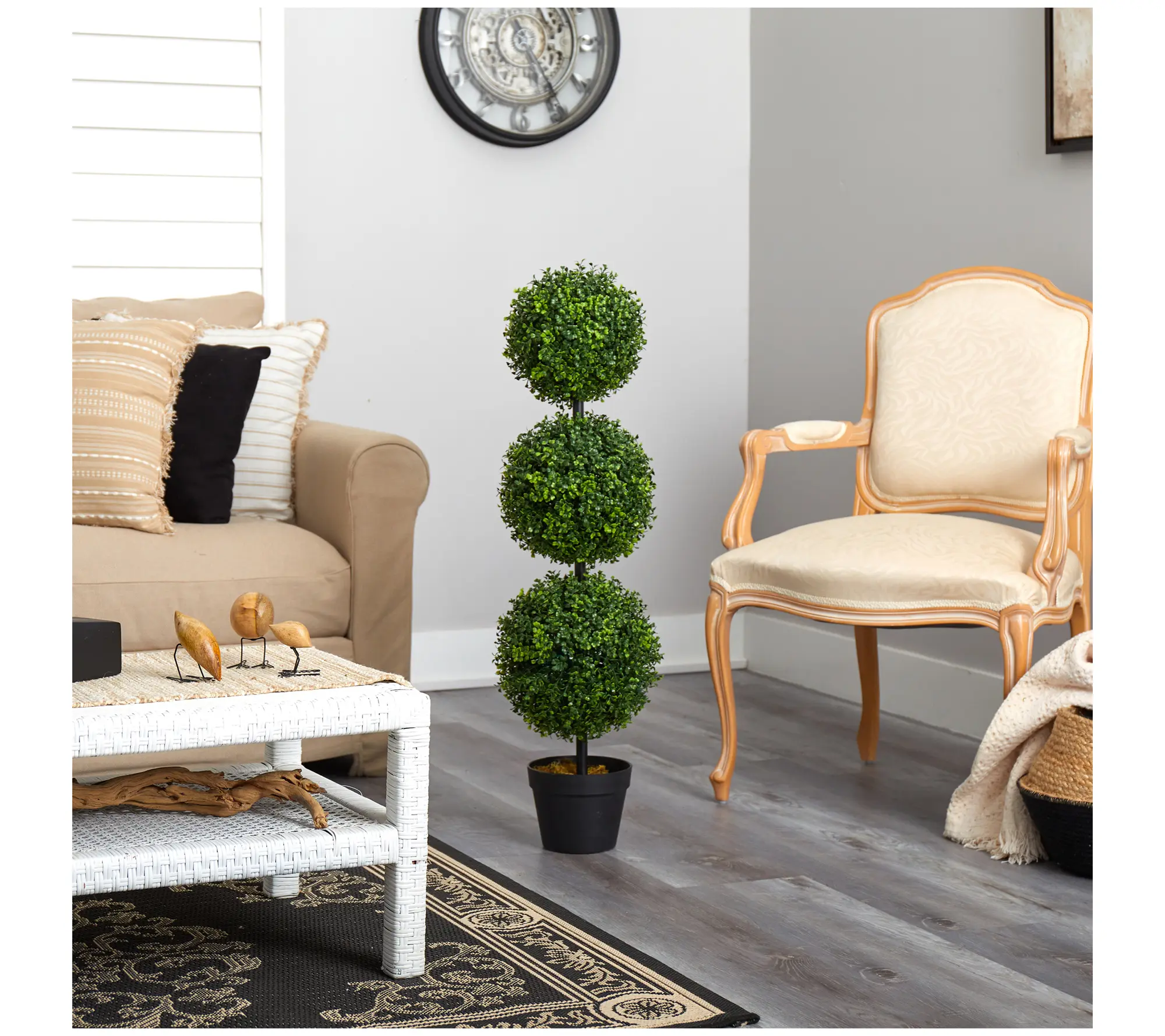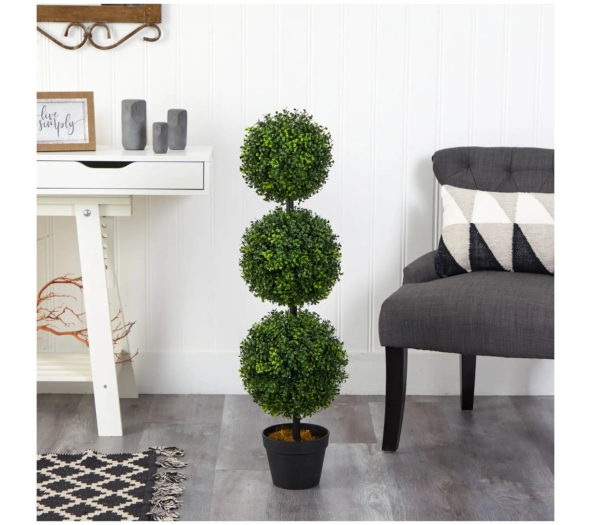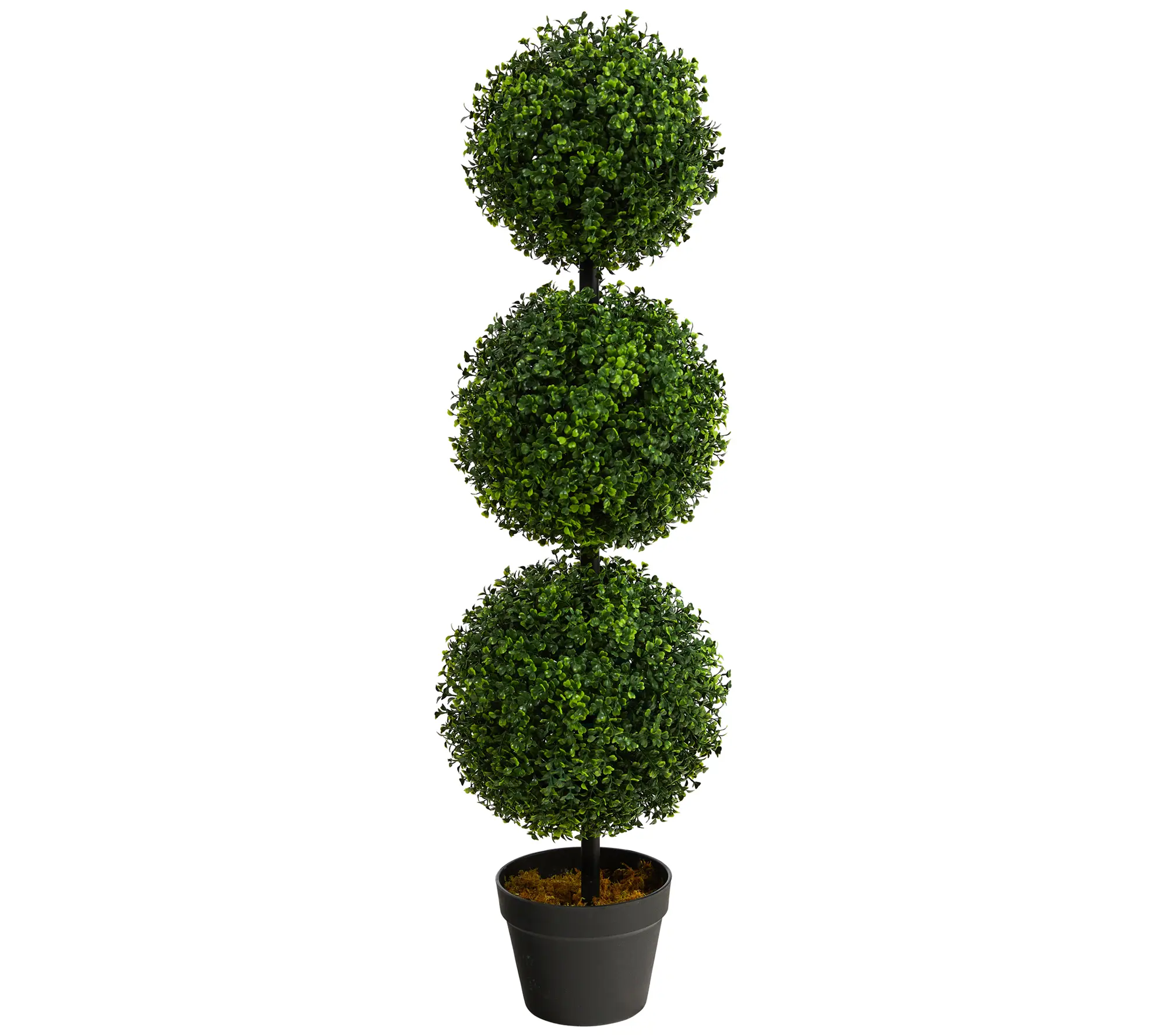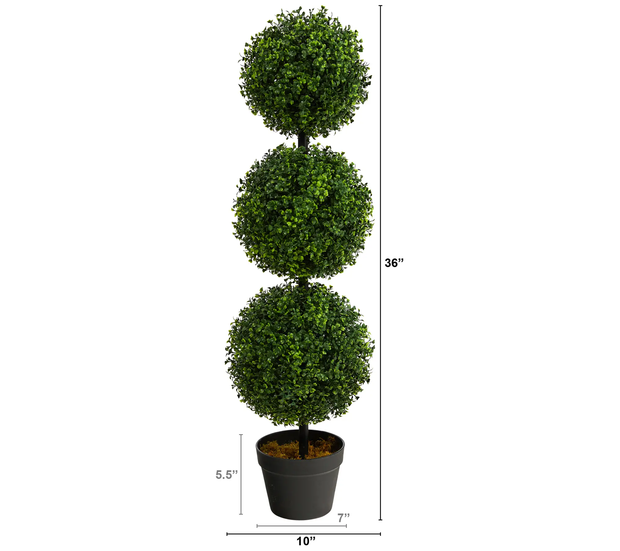 ·Includes lifelike boxwood triple ball topiary and black nursery planter