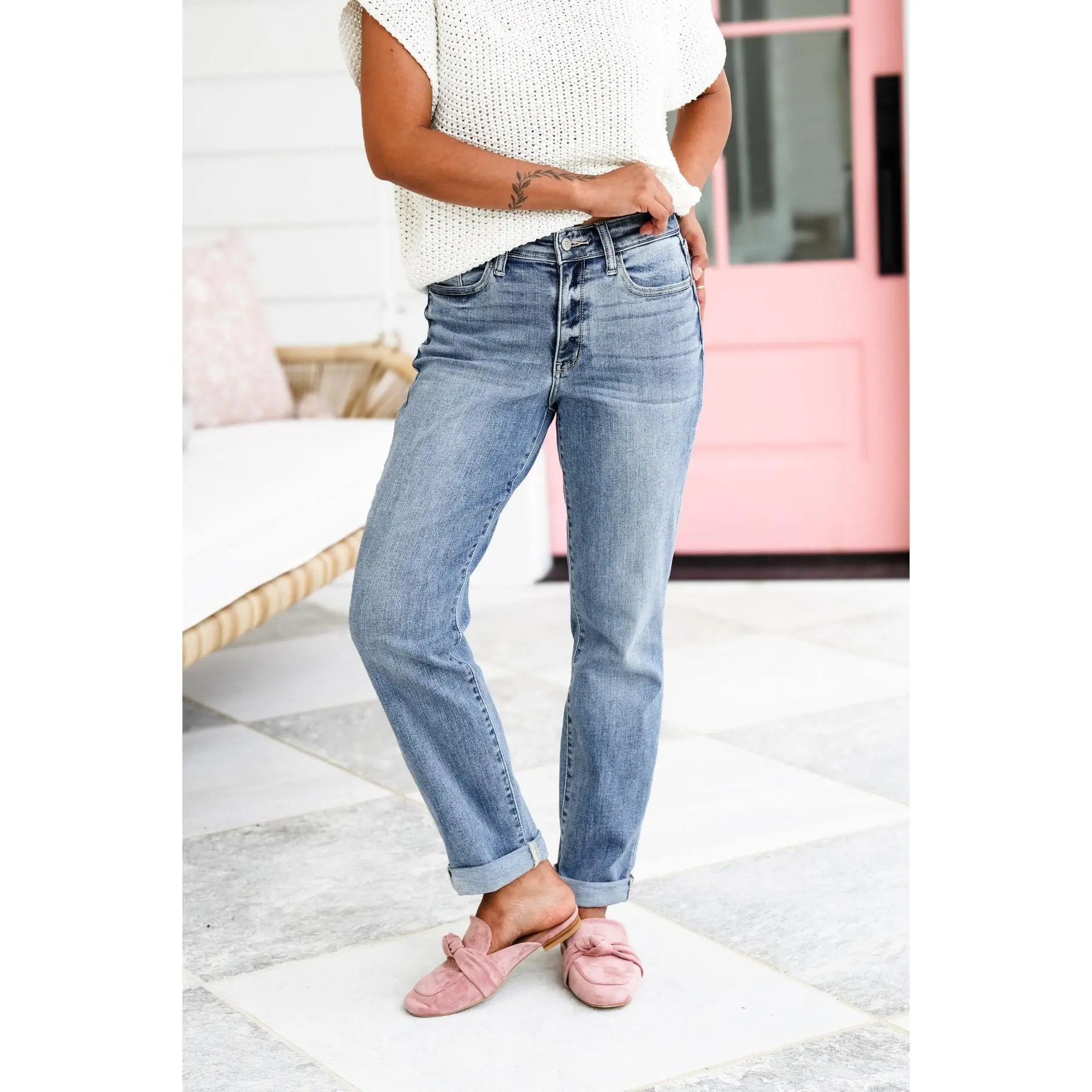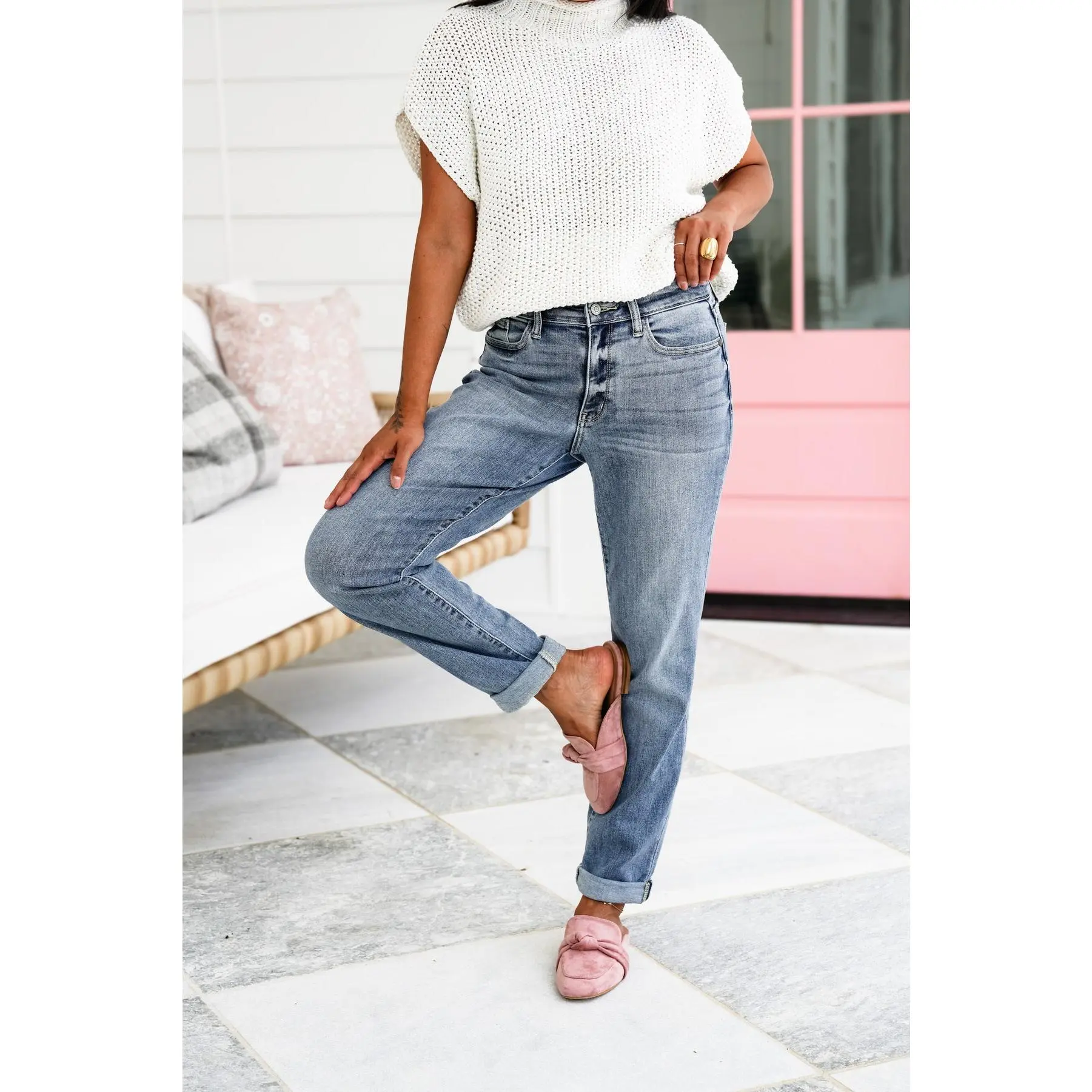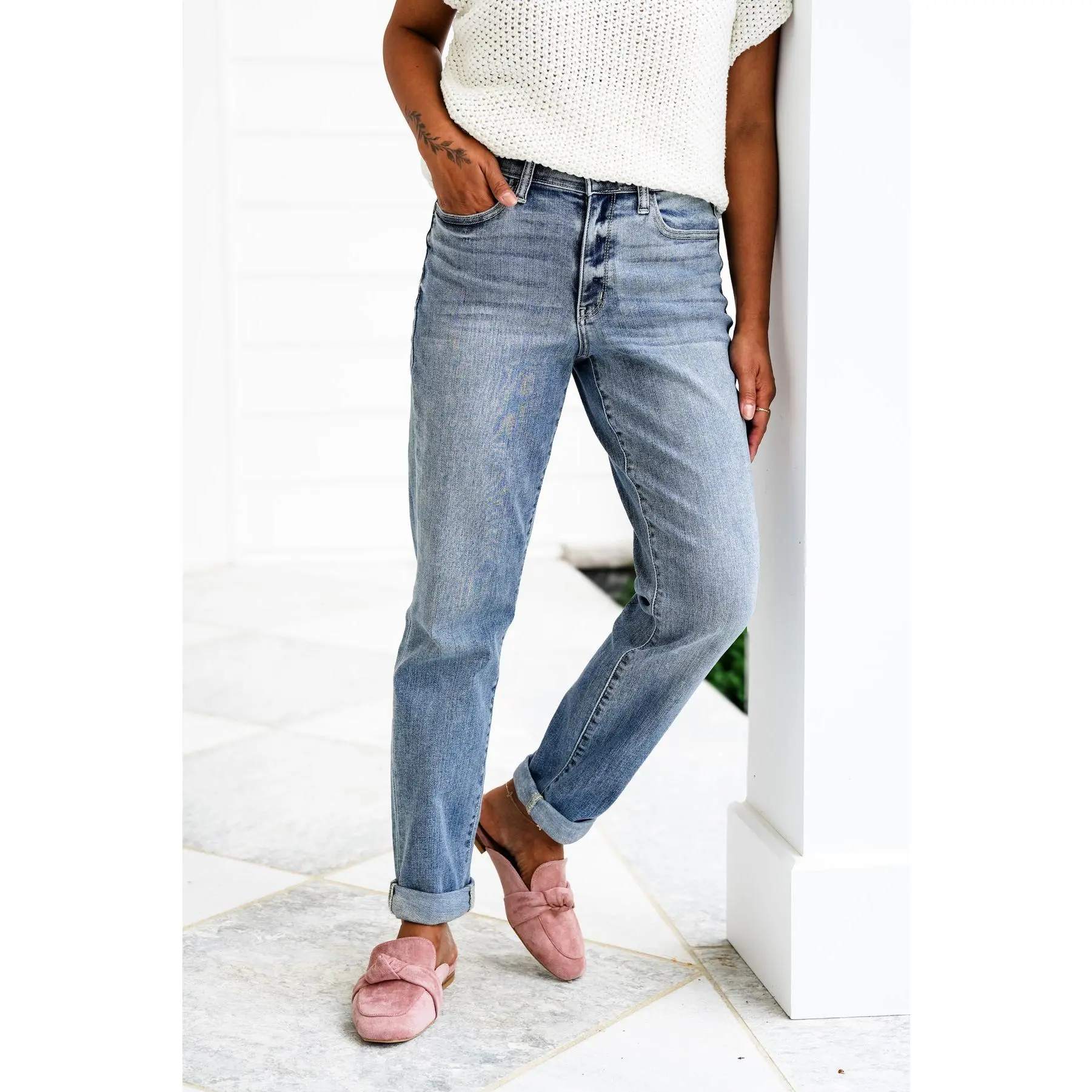 These boyfriend jeans are truly your new bestie! This pair has zero distressing for all of you lovers of a more clean cut look, and a stunning medium wash that truly goes with absolutely everything! The boyfriend silhouette is so flattering on all body shapes and sizes making it one of our favorites here at Freckled Poppy!