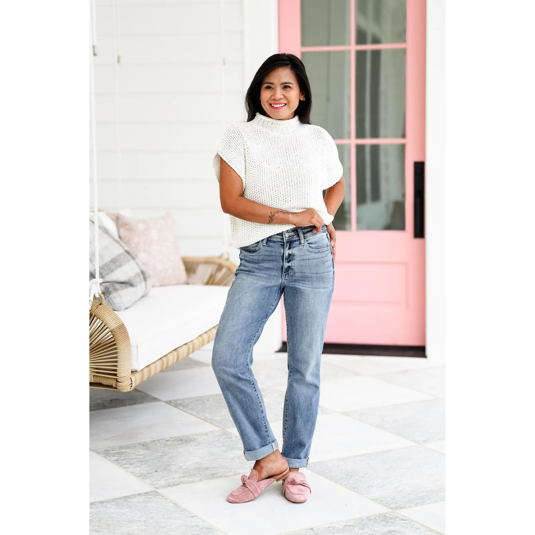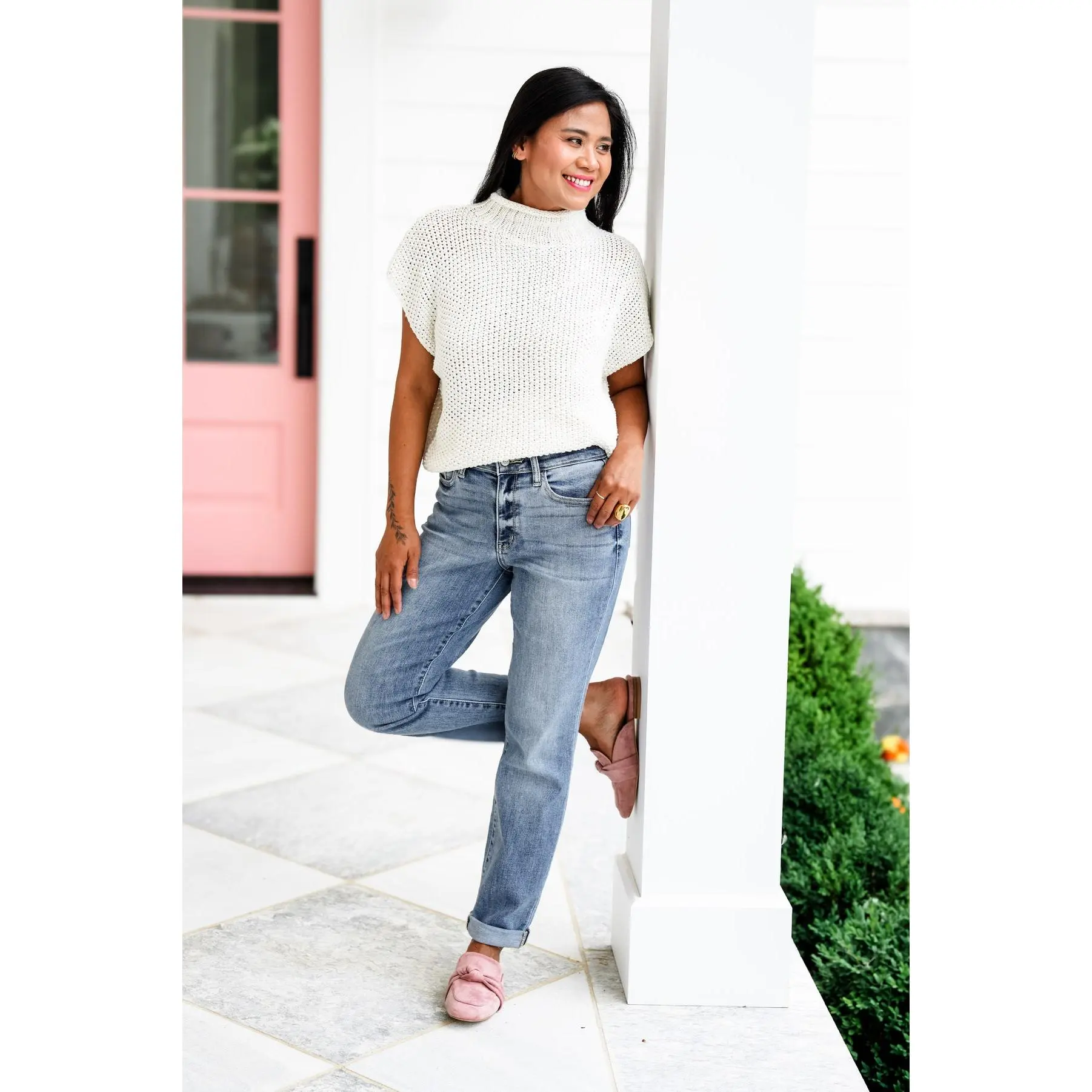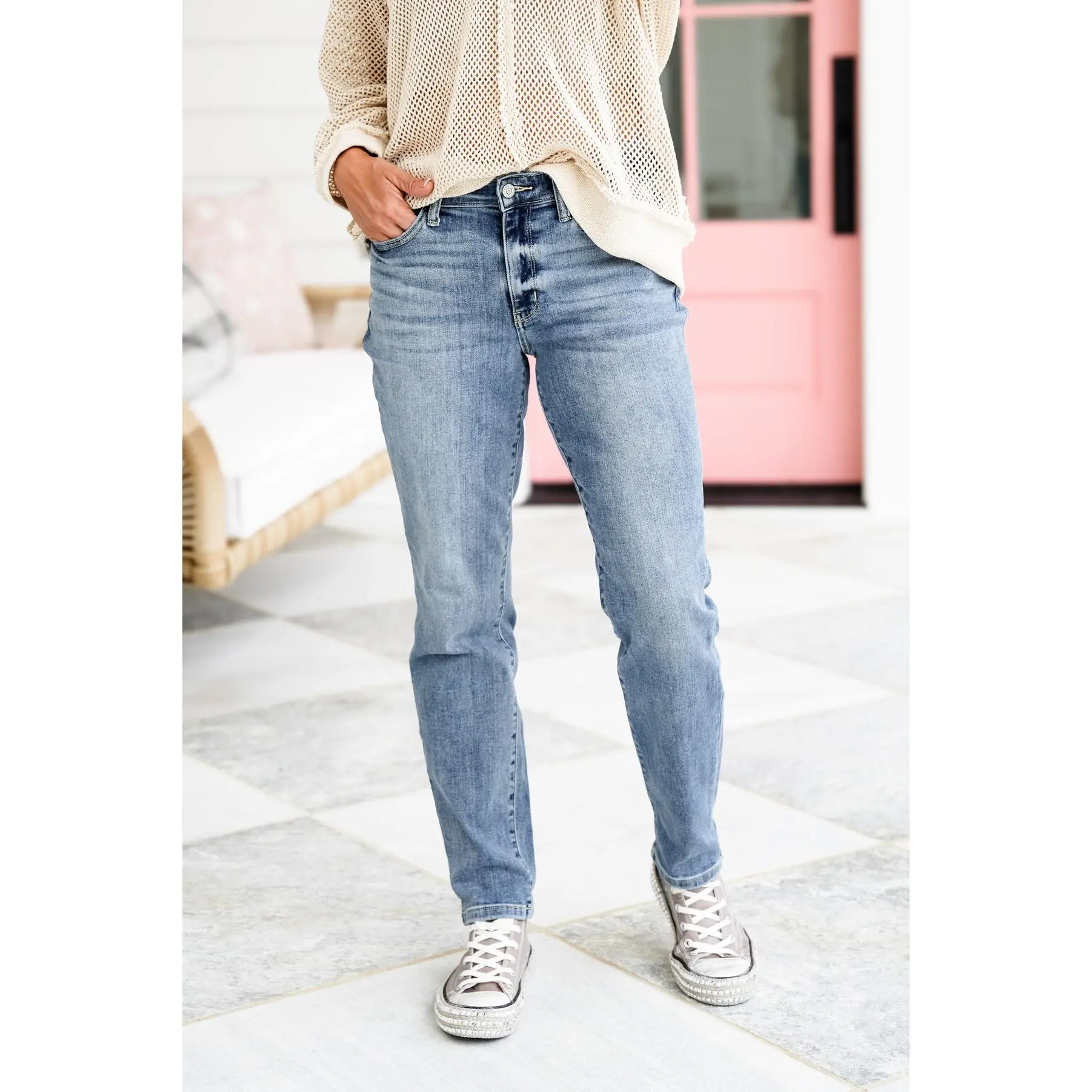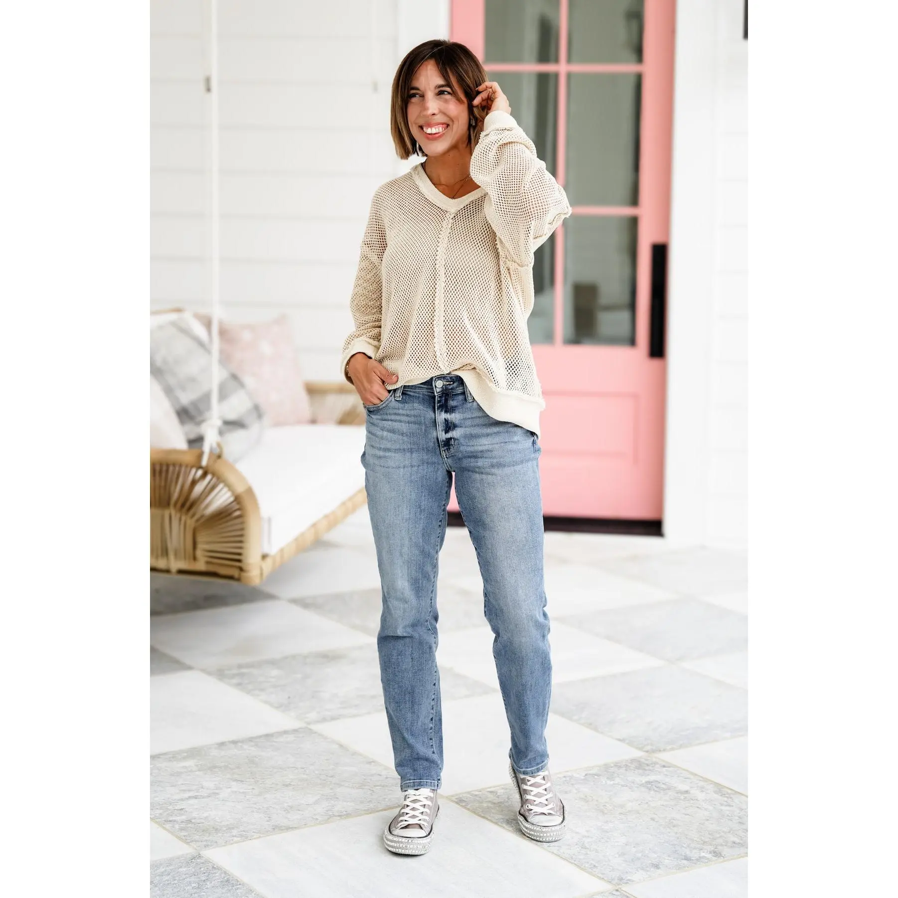 These boyfriend jeans are truly your new bestie! This pair has zero distressing for all of you lovers of a more clean cut look, and a stunning medium wash that truly goes with absolutely everything! The boyfriend silhouette is so flattering on all body shapes and sizes making it one of our favorites here at Freckled Poppy!