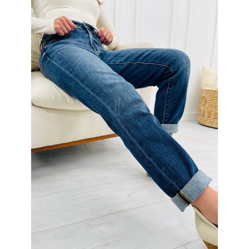 These dark wash jeans are the perfect wash for the colder seasons and they are slimming on every body type. These relaxed fit jeans are one of the most comfortable pairs of jeans we have ever released. They are soft, stretchy, and hold their shape all day long. They can easily be dressed up with booties or dressed down with mules or sneakers for multiple, versatile looks. They come cuffed for a trendy look but can be uncuffed for an alternative look or to add length!
