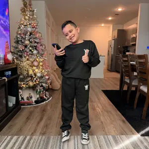 The sweatpants offer a comfortable fit, suitable for various activities. The set is part of our children's clothing range, ensuring your child looks and feels great. It's a perfect blend of functionality and trendy design.