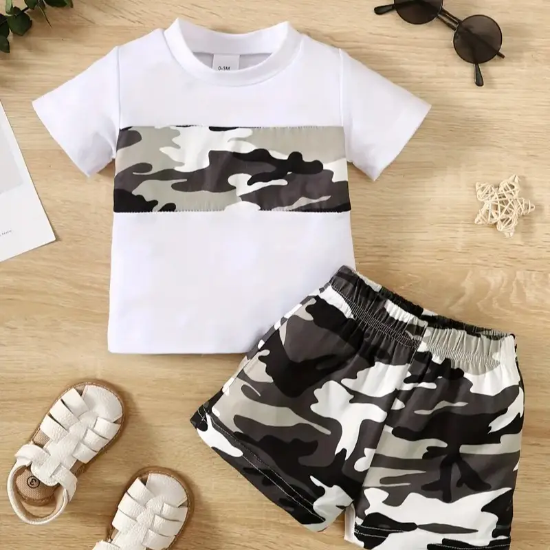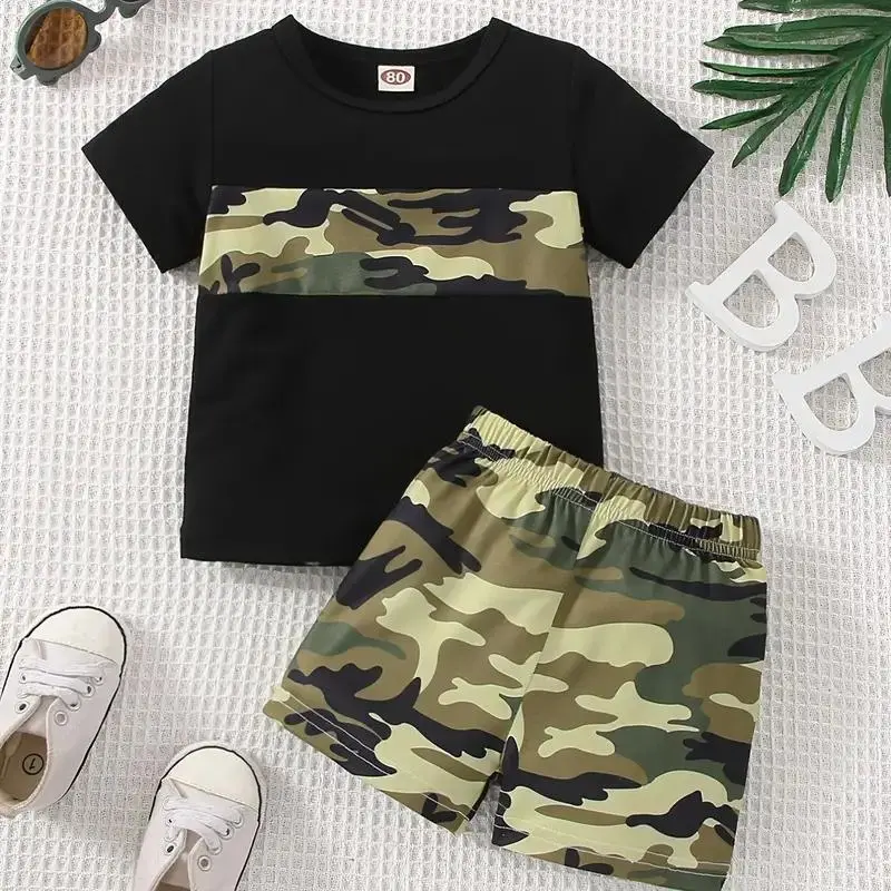 Ready Stock 9m-3y Baby Boys Summer Outfits Splice Short Sleeve Casual Tee Elastic Camo Shorts 2Pcs Clothes 22403083