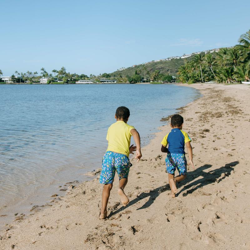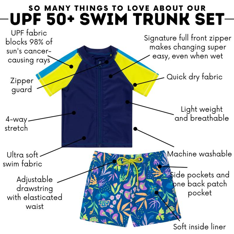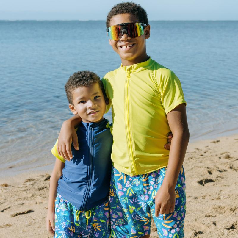 This set includes both comfy trunks and a super easy to get on and off, full zip short sleeve swim shirt. No more sunscreen battles because everywhere that’s covered by SwimZip is protected from the sun’s harmful rays!