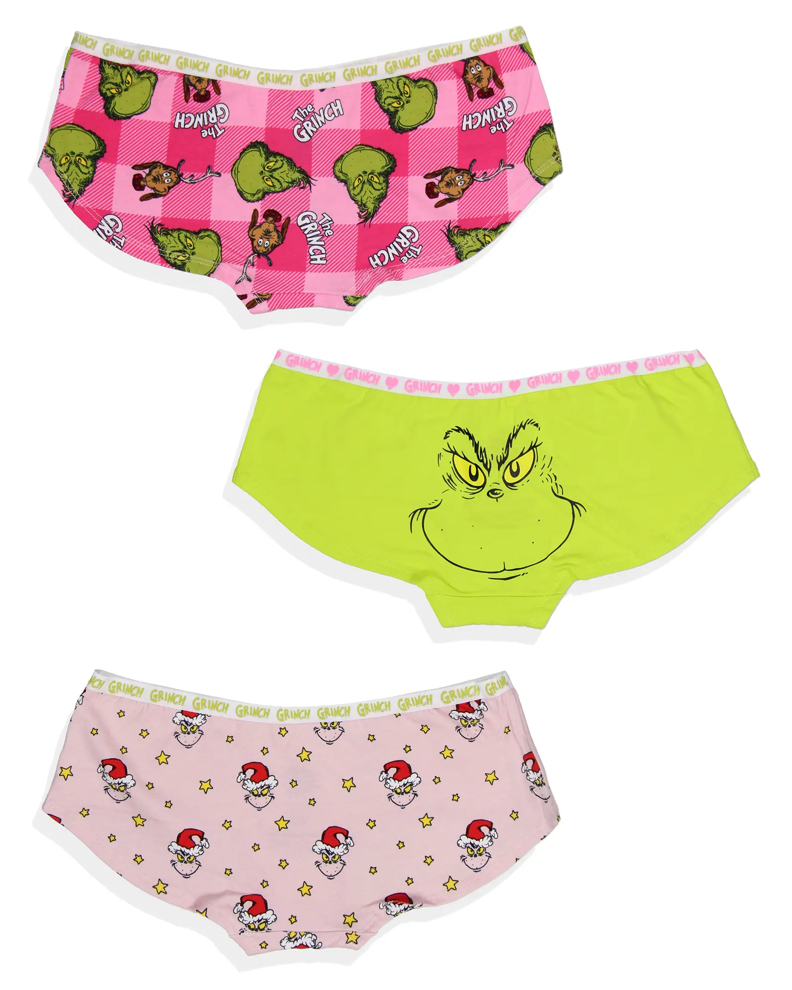 Add a mischievous twist to your holiday wardrobe with this 3-pack of Dr. Seuss The Grinch boyshorts! These fun, festive women’s underwear feature three distinctive designs that capture the playful spirit of The Grinch. These soft, comfortable boyshorts bring just the right amount of stretch and holiday cheer to keep you comfy all season long! Great Grinch Designs: Celebrate the holiday season in style with these playful boyshorts featuring fun Grinch designs. Each pair captures the mischievous charm of the Grinch, bringing a touch of Whoville to your everyday wear Three-Pack Boyshorts: These boyshorts-style briefs offer a comfortable, full-coverage fit with a flattering cut that’s easy to wear under any outfit Quality and Comfort: These Grinch boyshorts are designed with your comfort in mind. The durable material provides a snug yet flexible fit, ideal for everyday wear Versatile Wear: Designed with versatility in mind, these boyshorts are a festive choice for both lounging at home or layering under your favorite outfits Great Gift for Dr. Seuss Fans: Surprise a loved one or treat yourself with this distinctive 3-pack of Grinch-themed underwear. Fantastic for Dr. Seuss fans and Grinch lovers, these boyshorts make a fun holiday gift or stocking stuffer