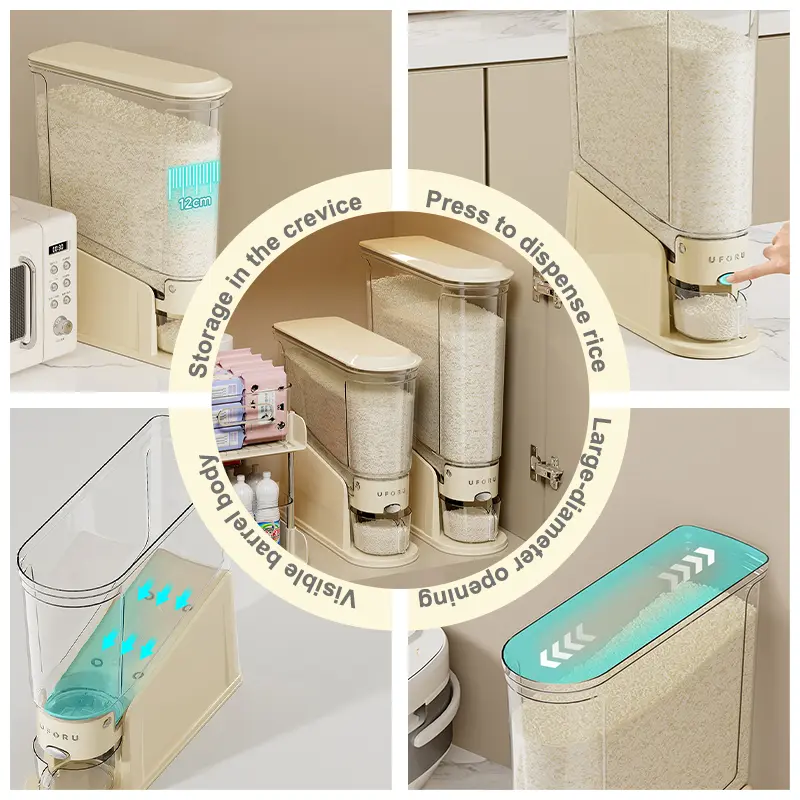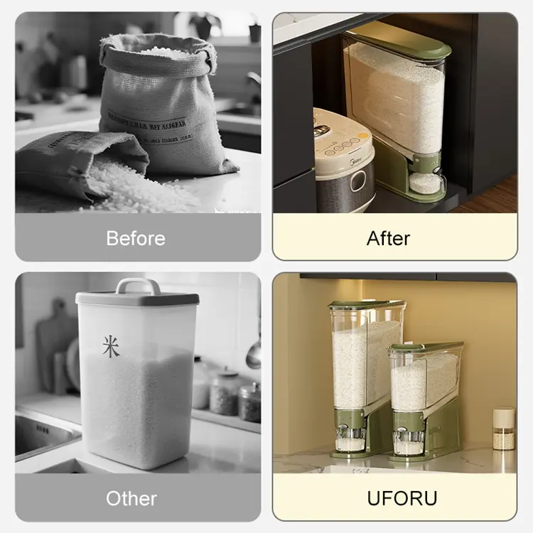 ·One-Touch Rice Holder Dispenser for Effortless Access: No more lifting lids—simply press the button on this dry food dispenser for quick, mess-free dispensing, streamlining meal prep and daily kitchen routines