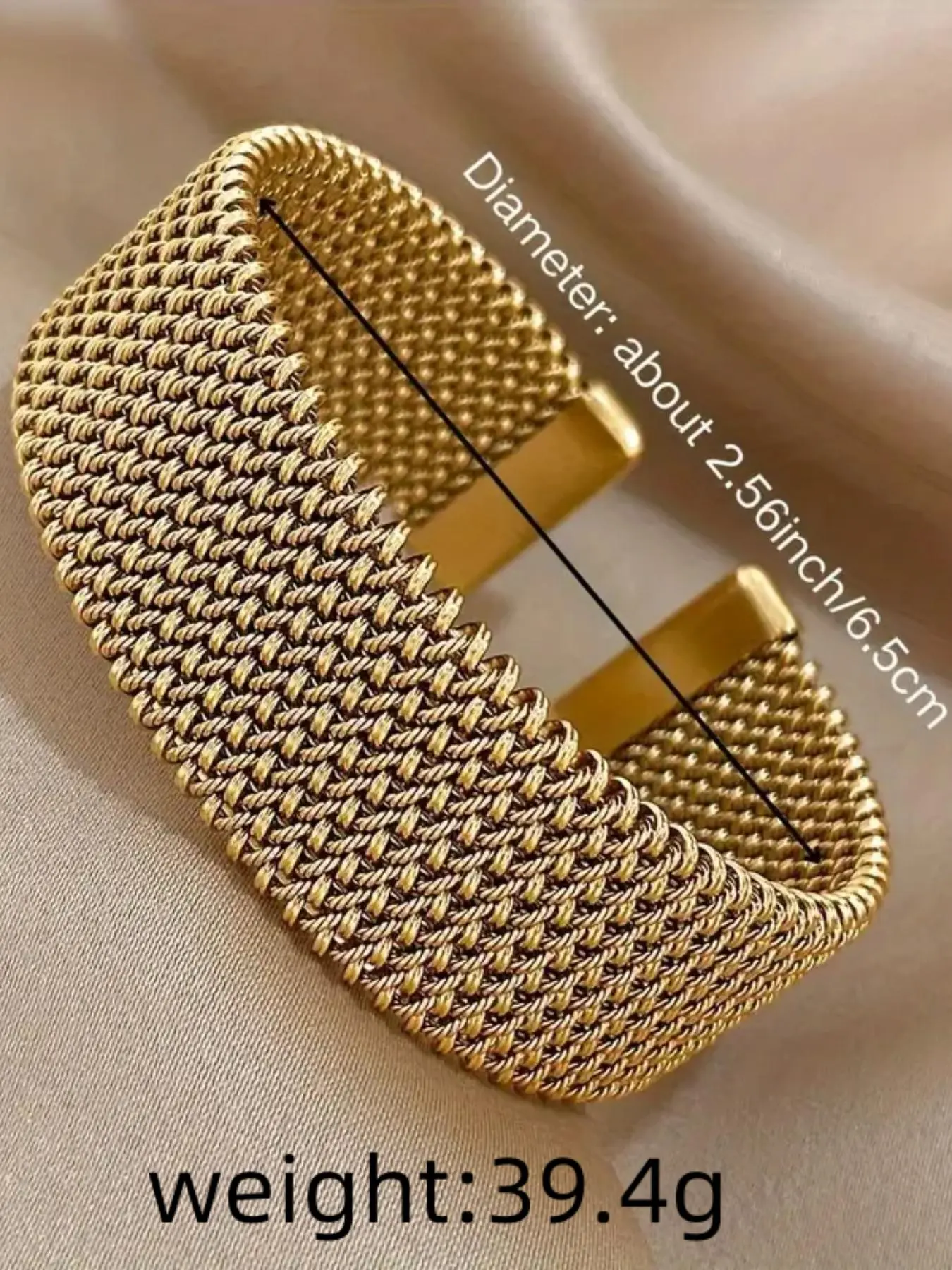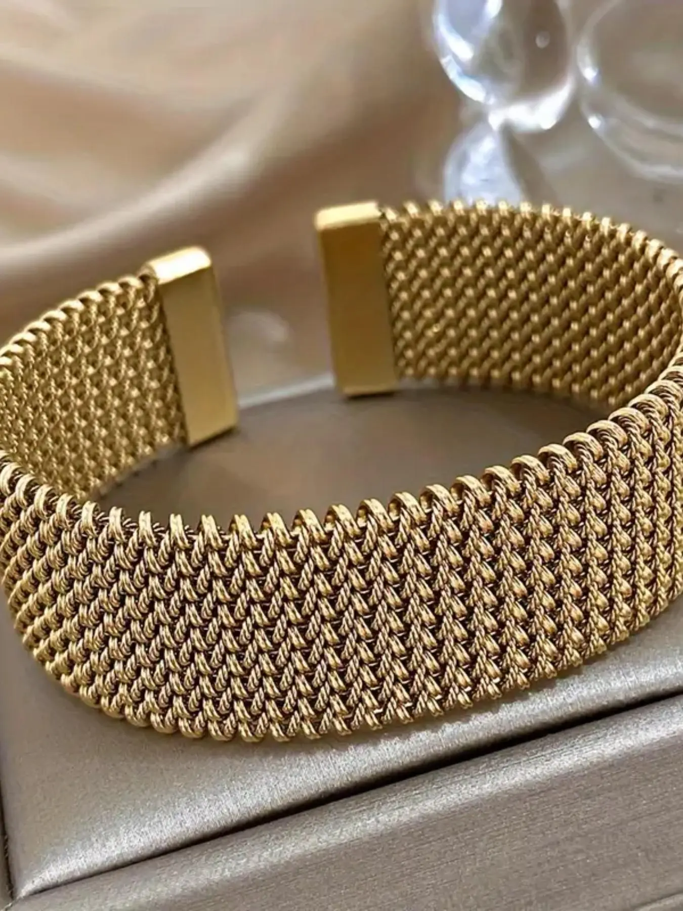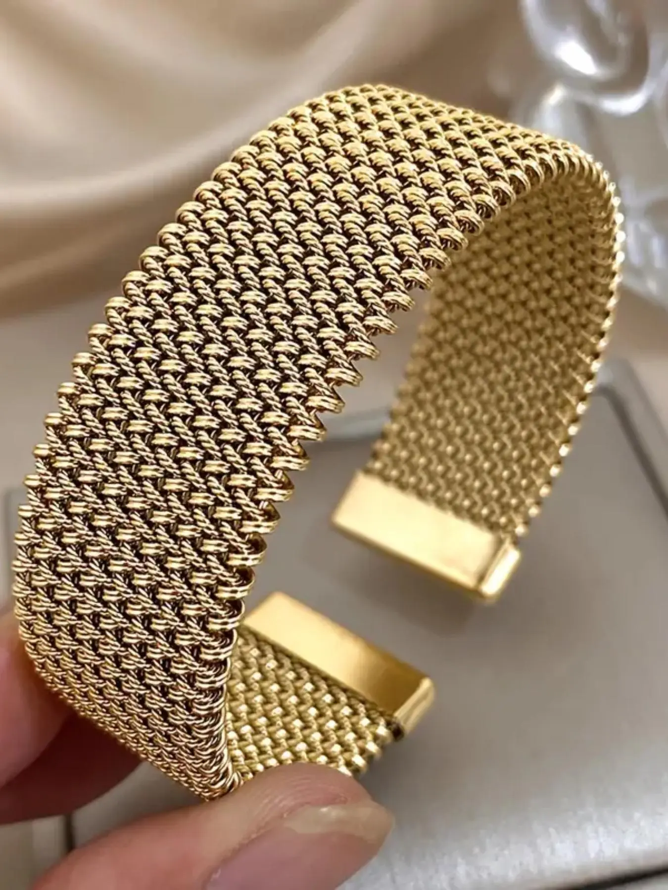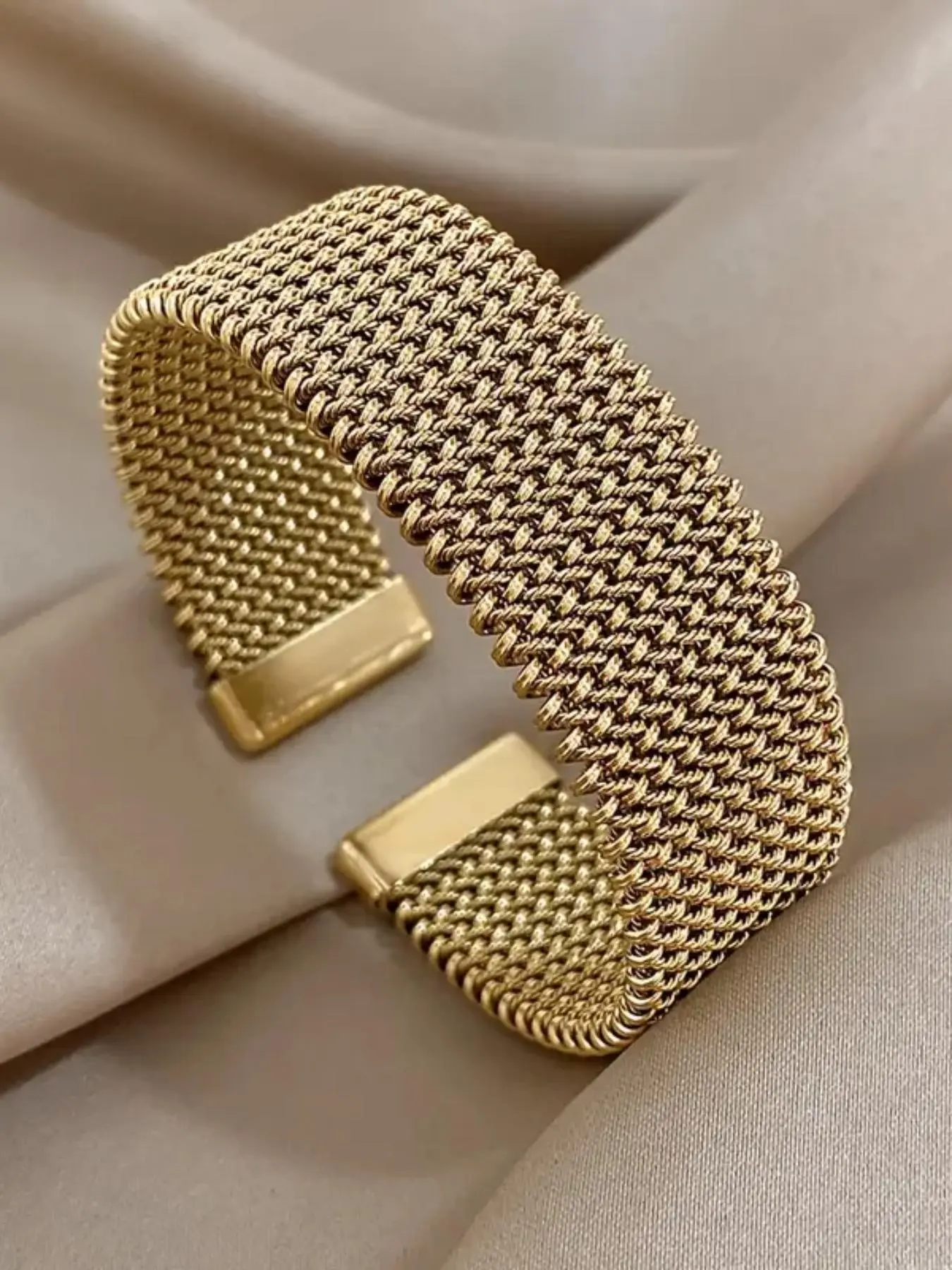 This is a gorgeous gold town mesh bracelet that has a little stretch to it. It’s very high-end and luxurious looking for an amazing price.