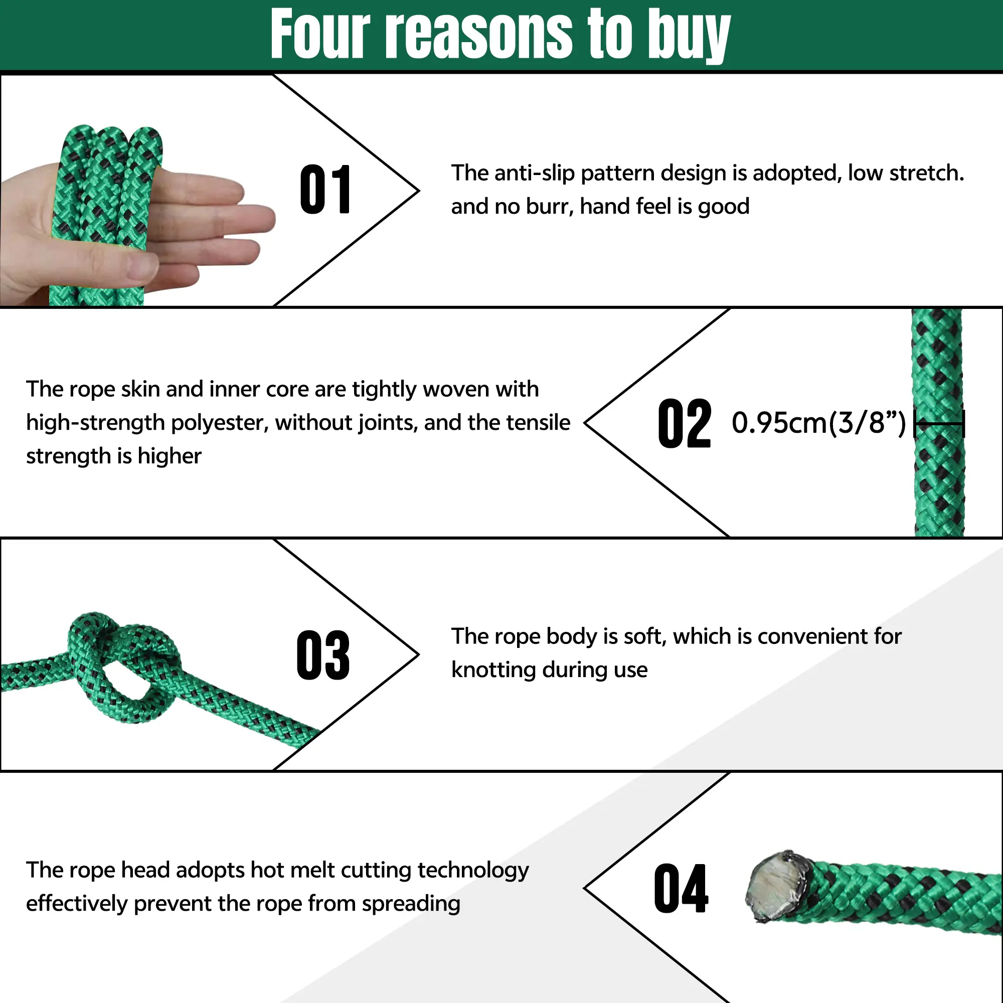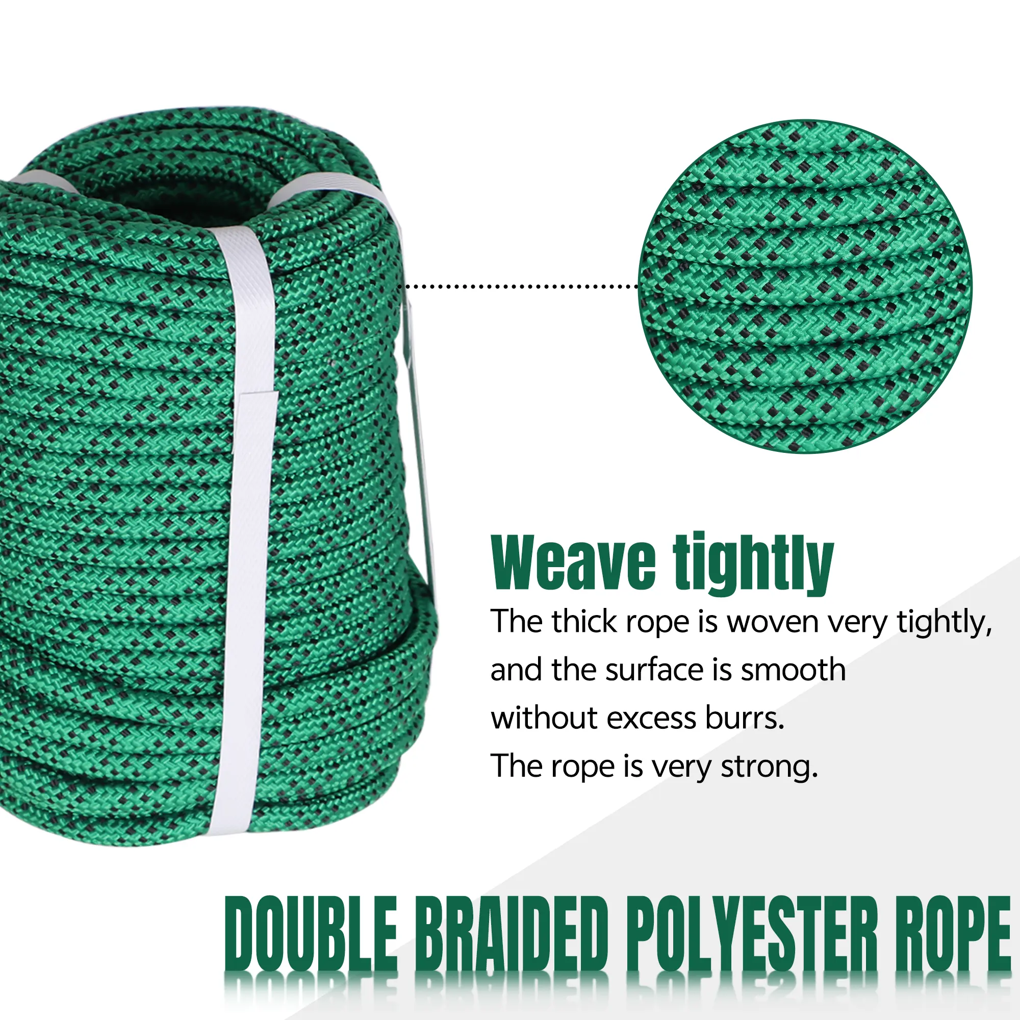 ·【New Technology】-Adopts 48 super high strength polyester strands at inner cores, high pulling force is ensured. the outer skin is reinforced polyester wires tightly woven, more wear-resisting. hot melt cutting technology, effectively prevent the rope from spreading.