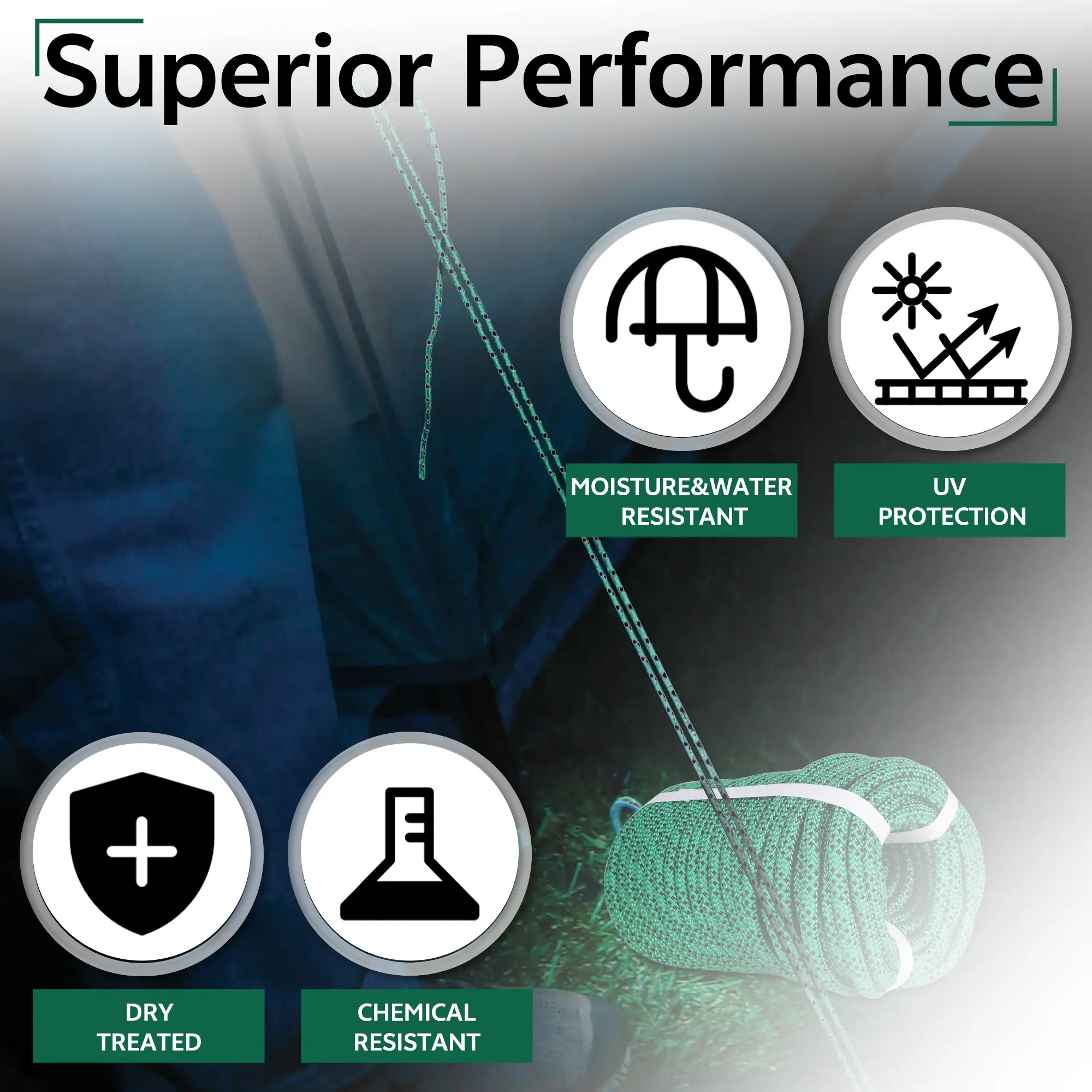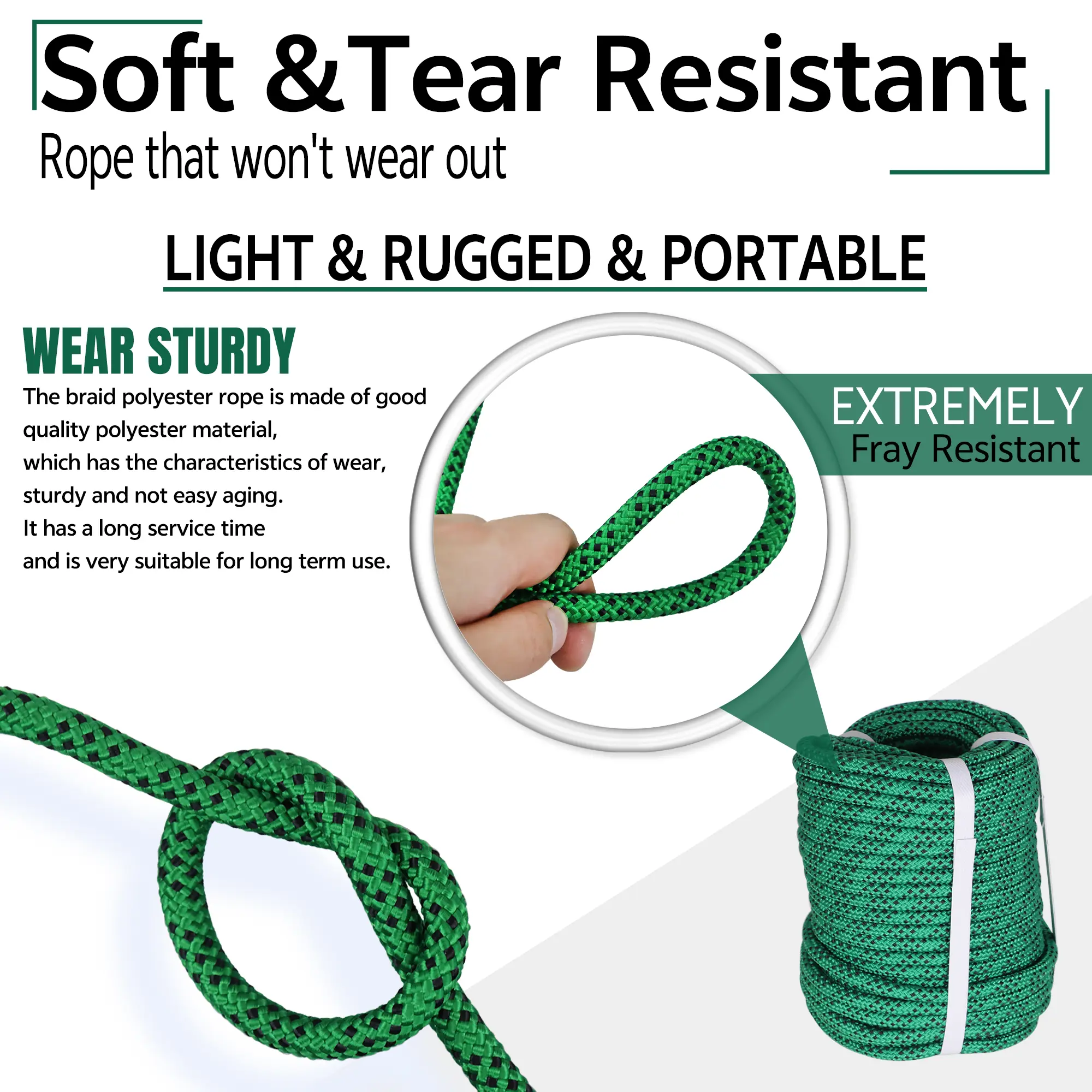 ·【Property】-Excellent resistance to moisture, UV rays. the rope is also flexible enough for operator to easy make knots.