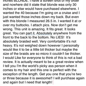 I am almost completely happy. I will say I ordered 40 inches BLONDE. I have a screen shot of my order and nowhere did it state that blonde was only 30 inches or else would have purchased elsewhere. I wanted the 40 because I’m going on a cruise and I just wanted those inches down my back. But even with this blonde I measured 26.5 in. I wanted it at or over my buttocks. I attach pics. Now don’t get me wrong. This unit is amazing. It fits great. It looks great. You can part it anywhere from the front to the back to the bottom. No LIES! It’s absolutely . See pics for more😍