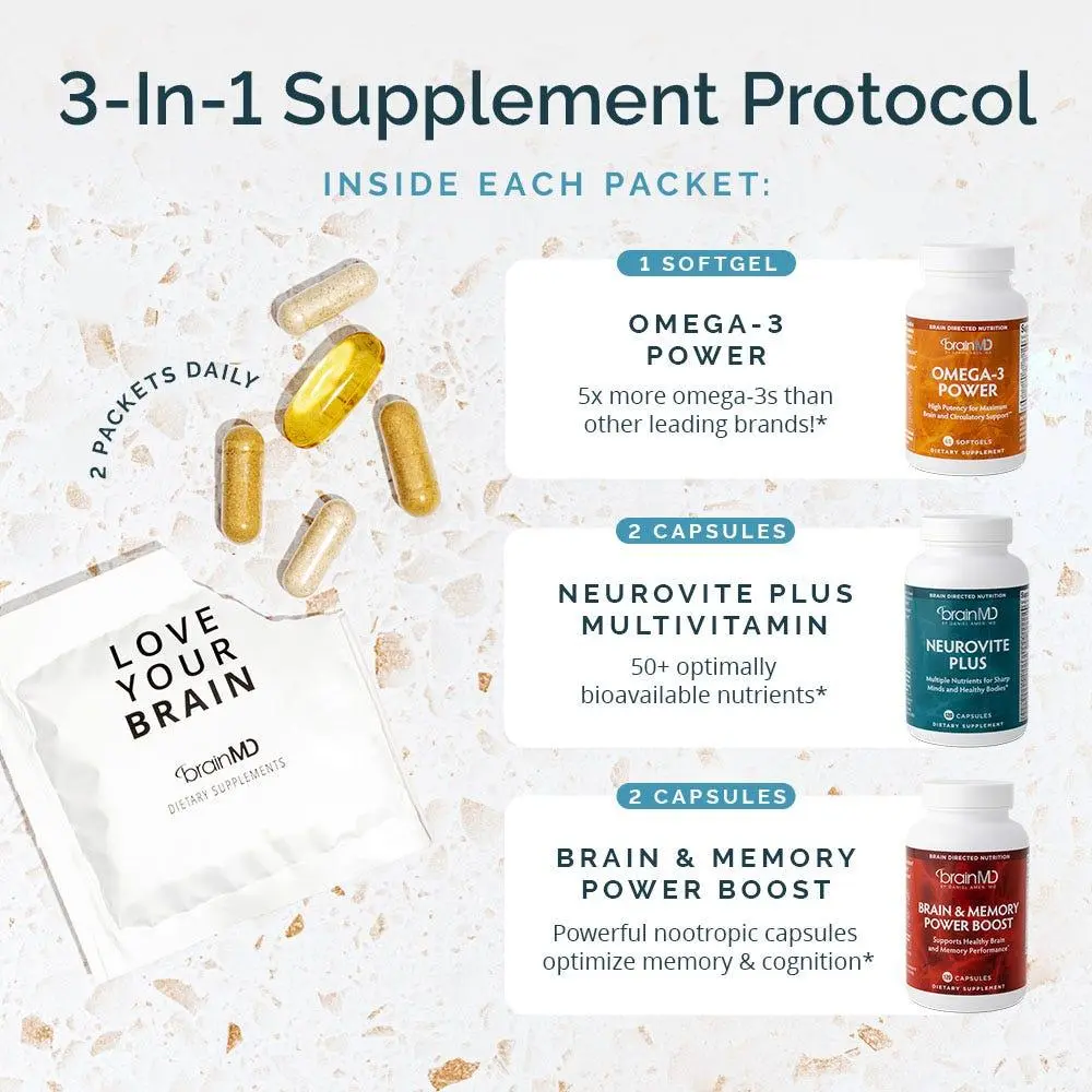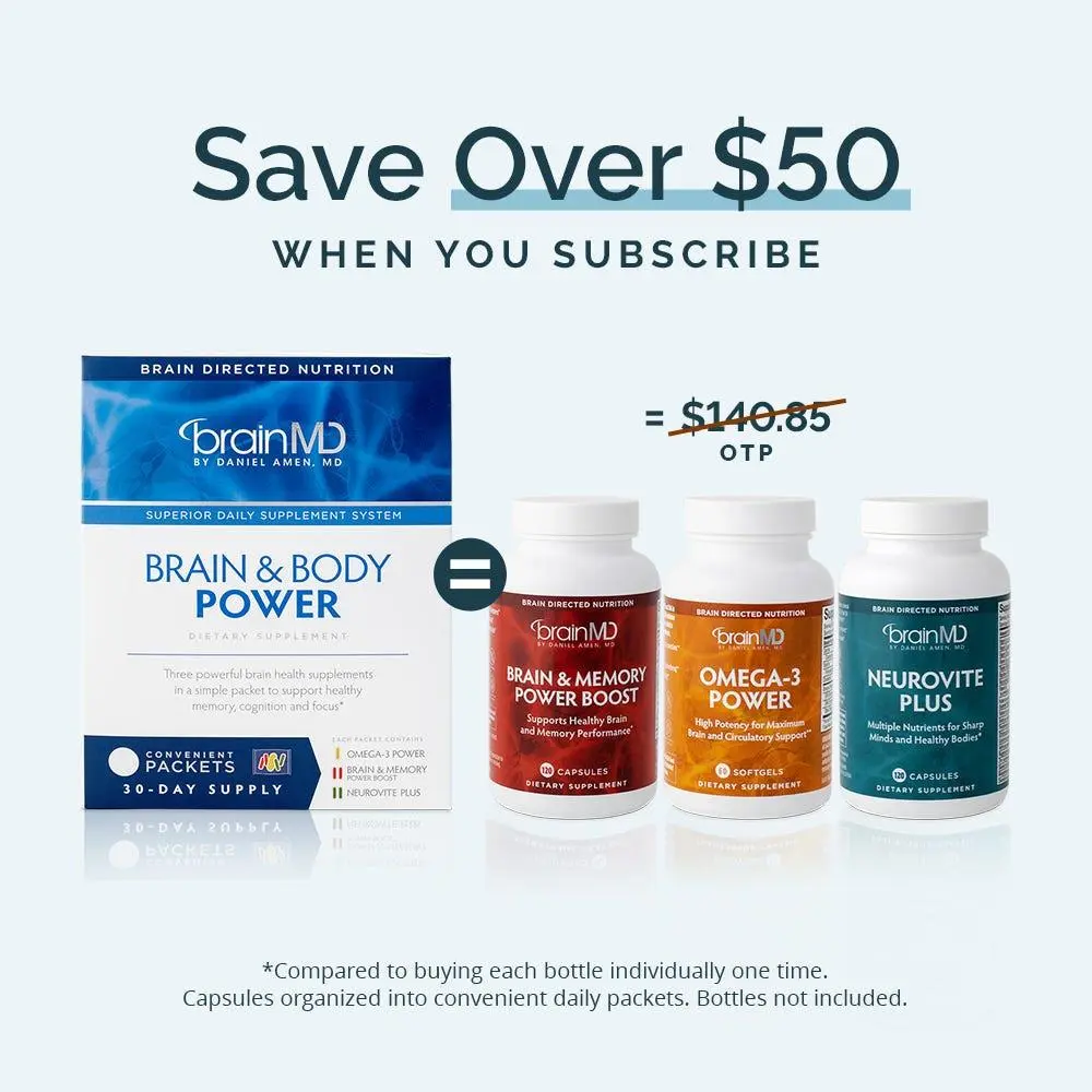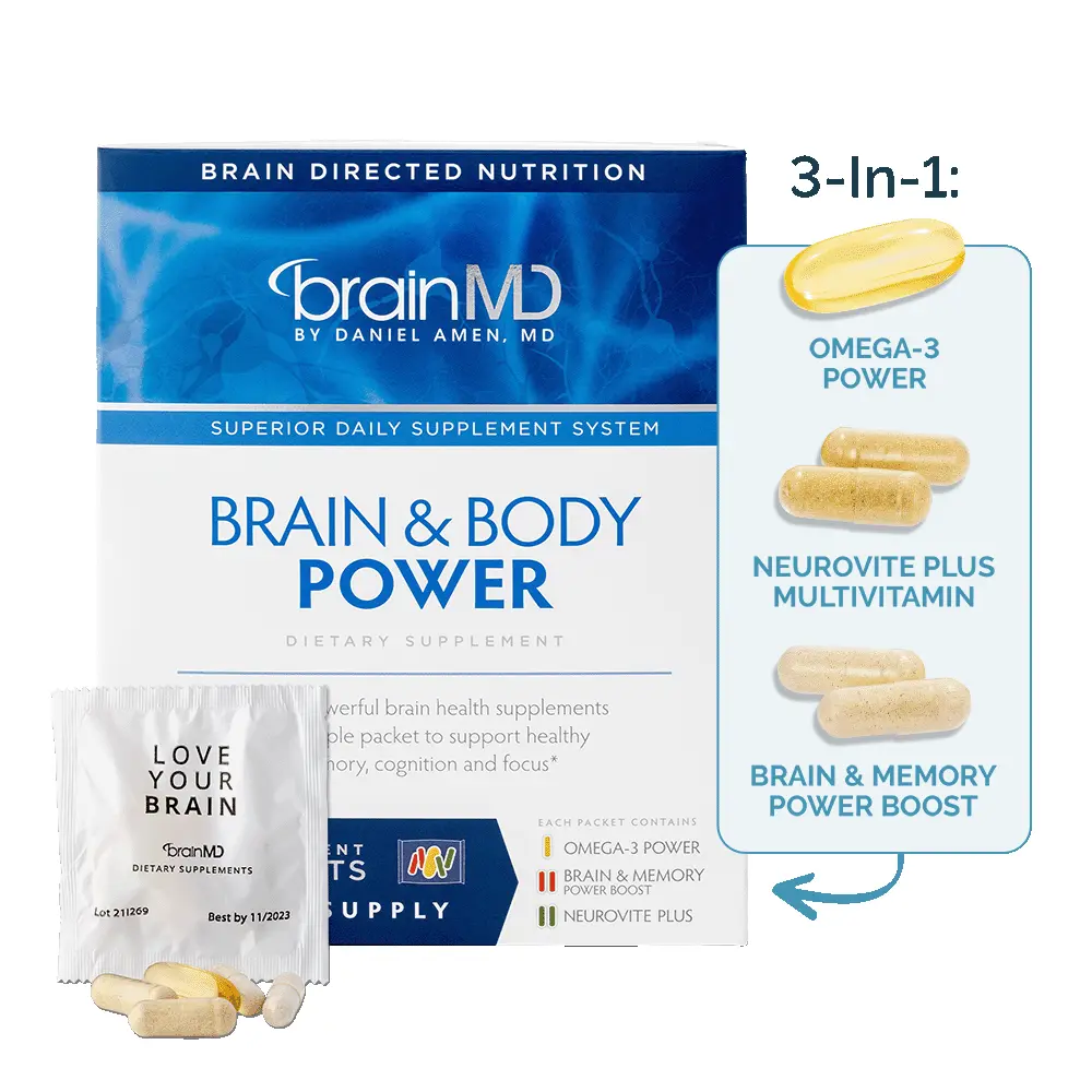 Looking for brain and memory supplements? With Brain & Body Power, you get three foundational products – a high-quality multivitamin, a pure omega-3 fish oil, and a brain-boosting formula – packaged into convenient daily packs, making whole-brain, whole-body nourishment a cinch.