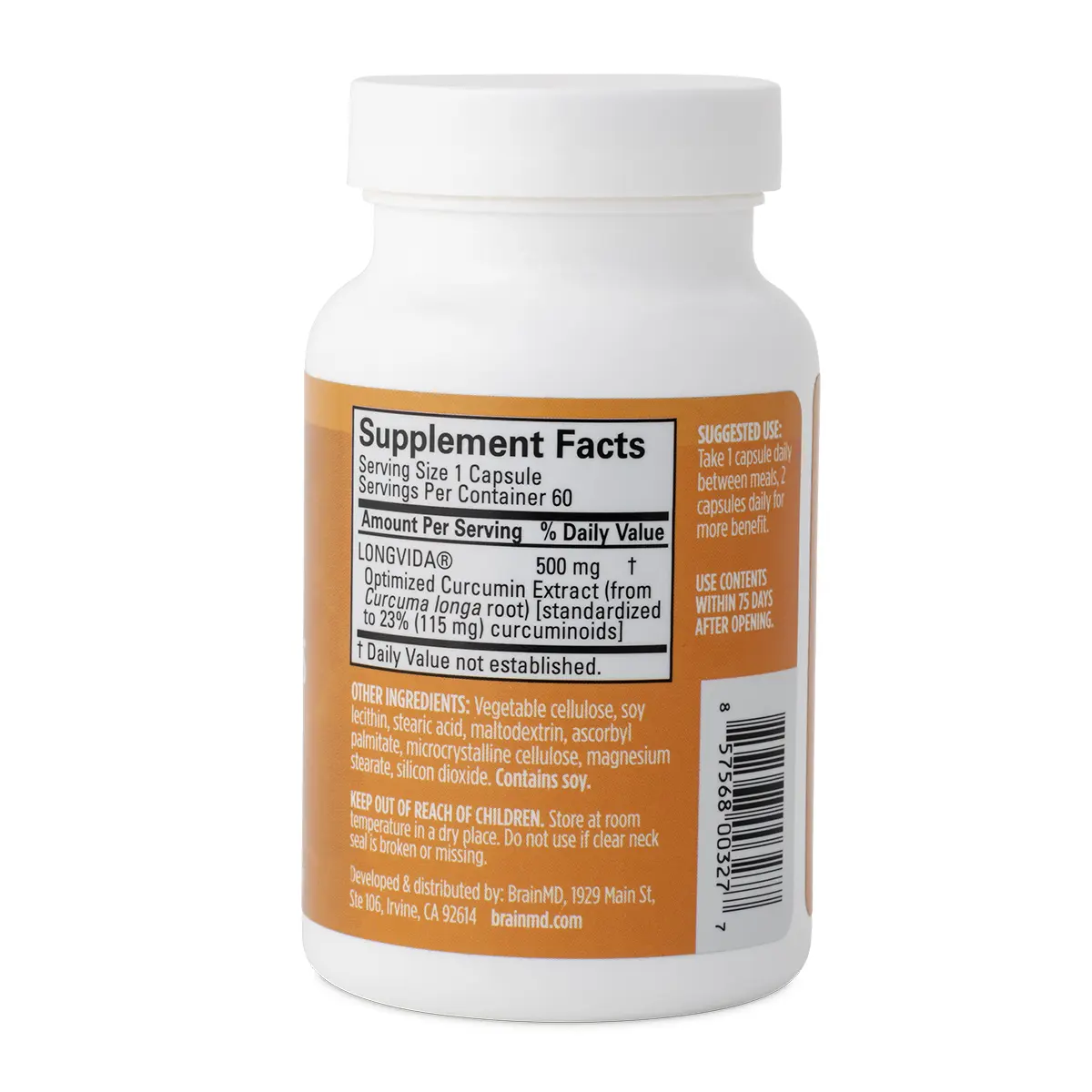 Brain Curcumins provides all three of the health-promoting curcuminoid substances found in the turmeric root. These curcuminoids have been concentrated into the highly effective, activated curcumin formula called Longvida® Optimized Curcumin Extract. In a double-blind clinical trial, subjects who received Longvida curcumin showed better sustained attention and working memory (such as multitasking) just 1 hour after taking it. Also, Brain Curcumins supplies 25% more Longvida per capsule (500 mg) than was used in the trial (400 mg), for additional benefit to mind and body.