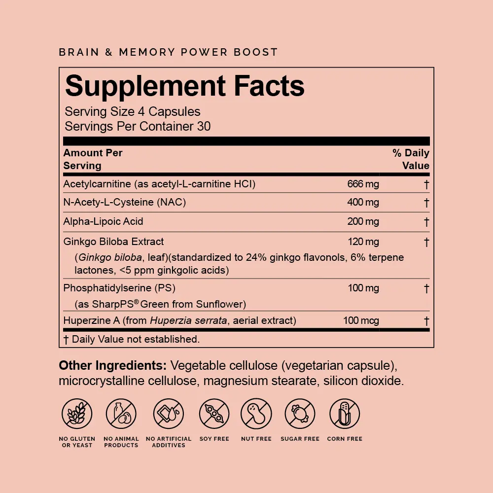 With a powerful lineup of clinically tested nutrients like PhosphatidylSerine (PS), Ginkgo Biloba, and Acetylcarnitine to support optimal brain function, healthy brain metabolism, and mental connectivity, Brain & Memory Power Boost is a key component to maintaining a healthy memory. It contains nutrients and standardized herbs that support blood flow to the brain, optimal functioning of the trillions of connections between the nerve cells (synapses), energy generation in the brain, and the activity of acetylcholine, the brain's main transmitter involved in memory as well as attention and other cognitive functions.