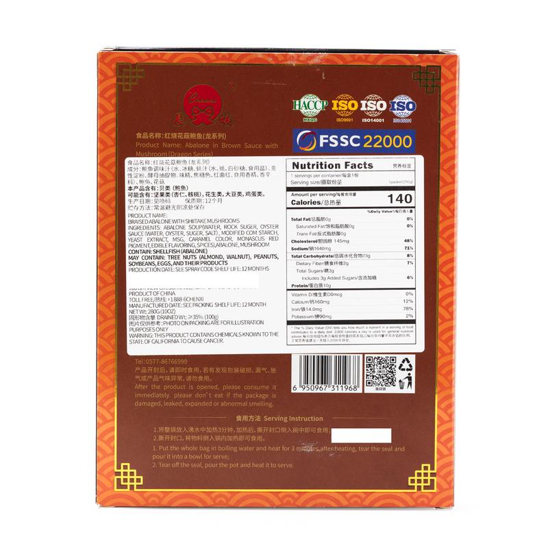 Abalone: Indulge in the refined texture of abalone, uniquely tender and irresistibly chewy – an unparalleled culinary delight; Shiitake Mushrooms: Cultivated in nature, meticulously chosen for their exceptional quality, boasting a naturally refreshing aroma and a deeply satisfying taste. Complemented by a flavorful and hearty broth crafted through a 600-minute vacuum pressure extraction, staying true to ancient methods. This meticulous process ensures the full retention of nutritional goodness. The rich essence of abalone delivers a smooth and genuine taste, with no blending or added preservatives.