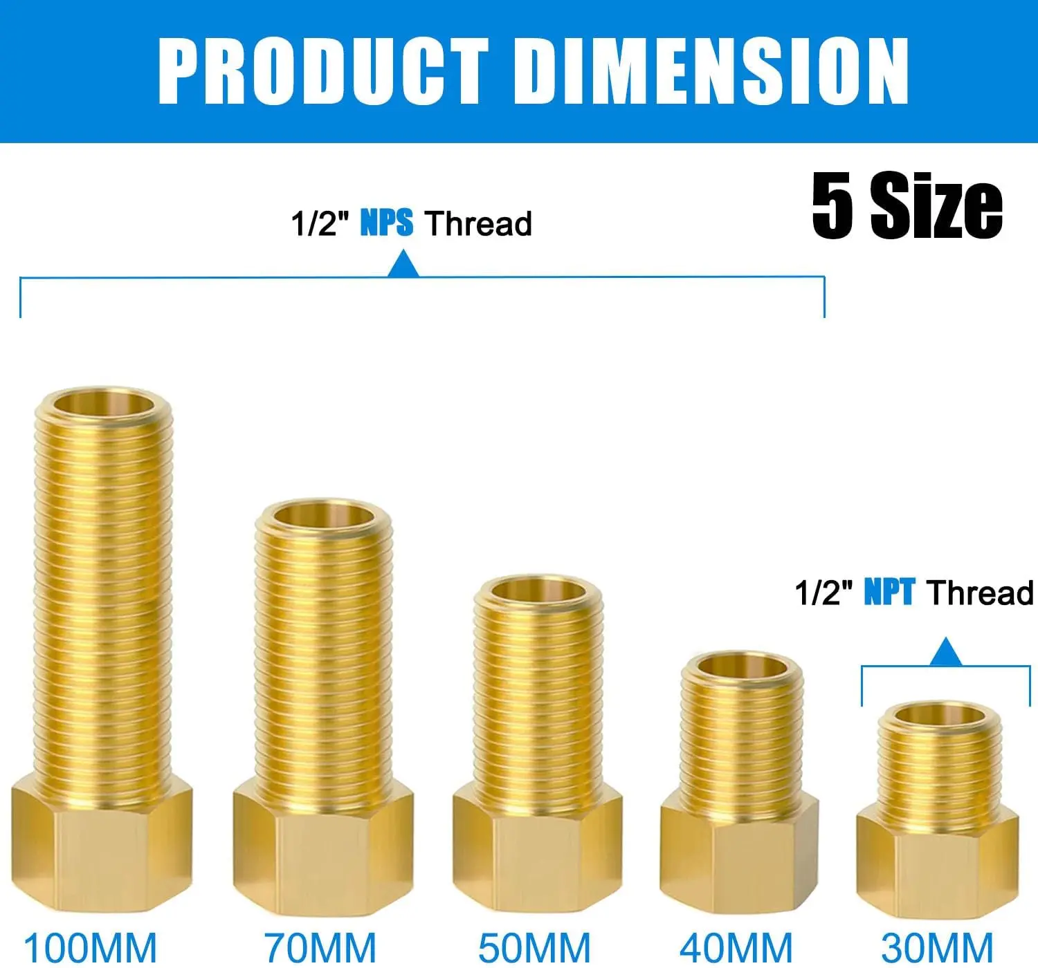 【Thread Size】1/2" male to 1/2" female Brass Pipe Fitting Set, ATTENTION: Length 30MM fitting is NPT thread (taper thread). 40MM,50MM,70MM,100MM fittings are NPS thread (straight thread).